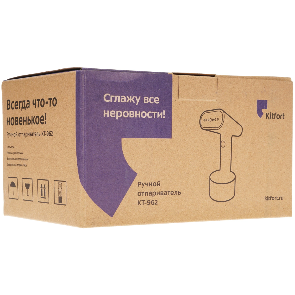 Отпариватель Kitfort КТ-962 представлен в компактном ручном дизайне с эргономичным белым корпусом. Прибор дополнен съемным баком для воды на 0.15 л, что упрощает процесс ухода. Оборудование работает от стандартной электросети на 220 В с мощностью 1500 Вт.