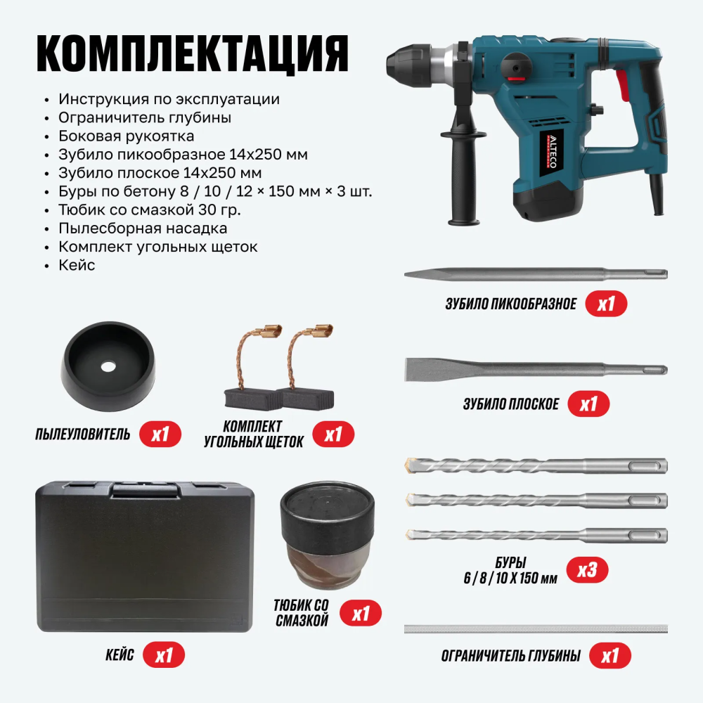 Перфоратор ALTECO RH 1500-32 SDS-Plus - предназначен для сверления, бурения и долбления в бетоне, кирпиче и других твердых материалах. Мощный двигатель 1500 Вт обеспечивает энергию удара 5 Дж. Фиксация кнопки включения и мягкая накладка на рукоятке обеспечивают комфорт, безопасность и надёжность в работе. Идеально подходит как для профессионального использования, так и для бытовых задач.