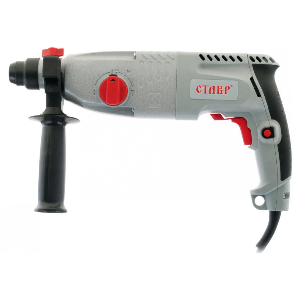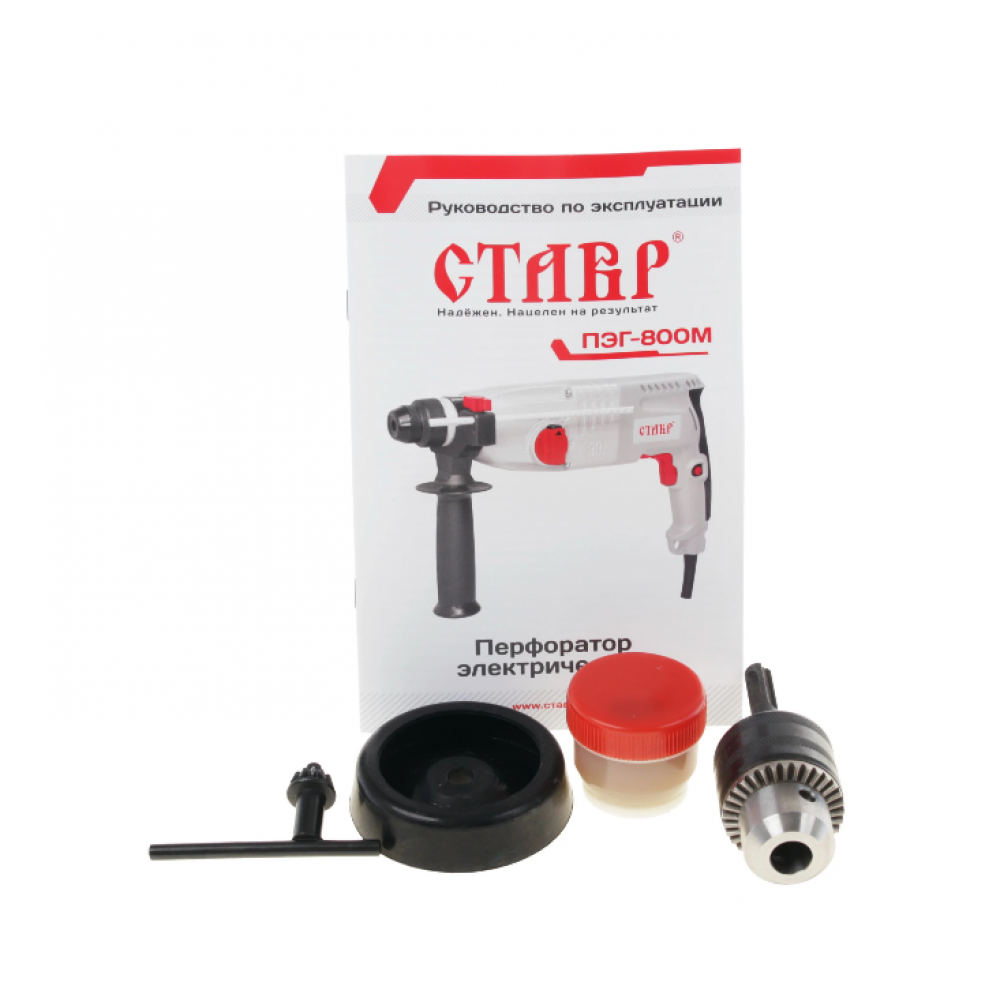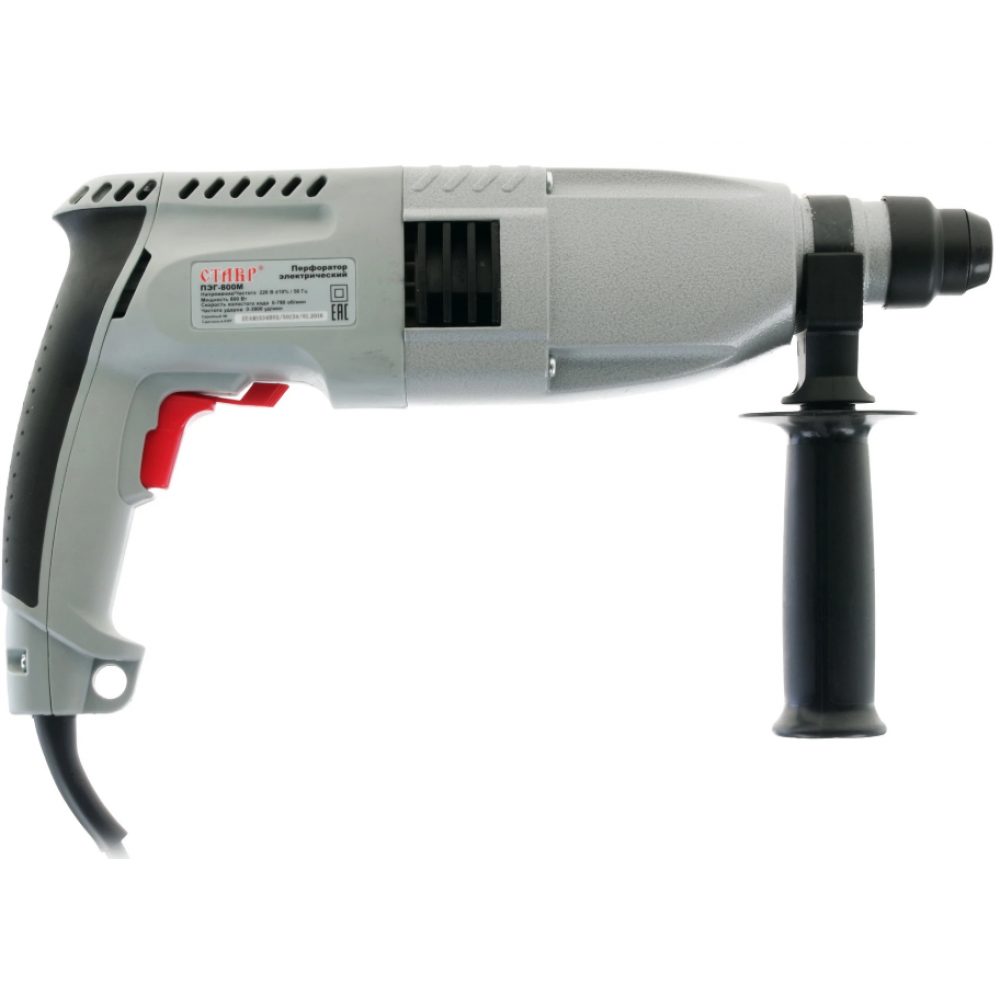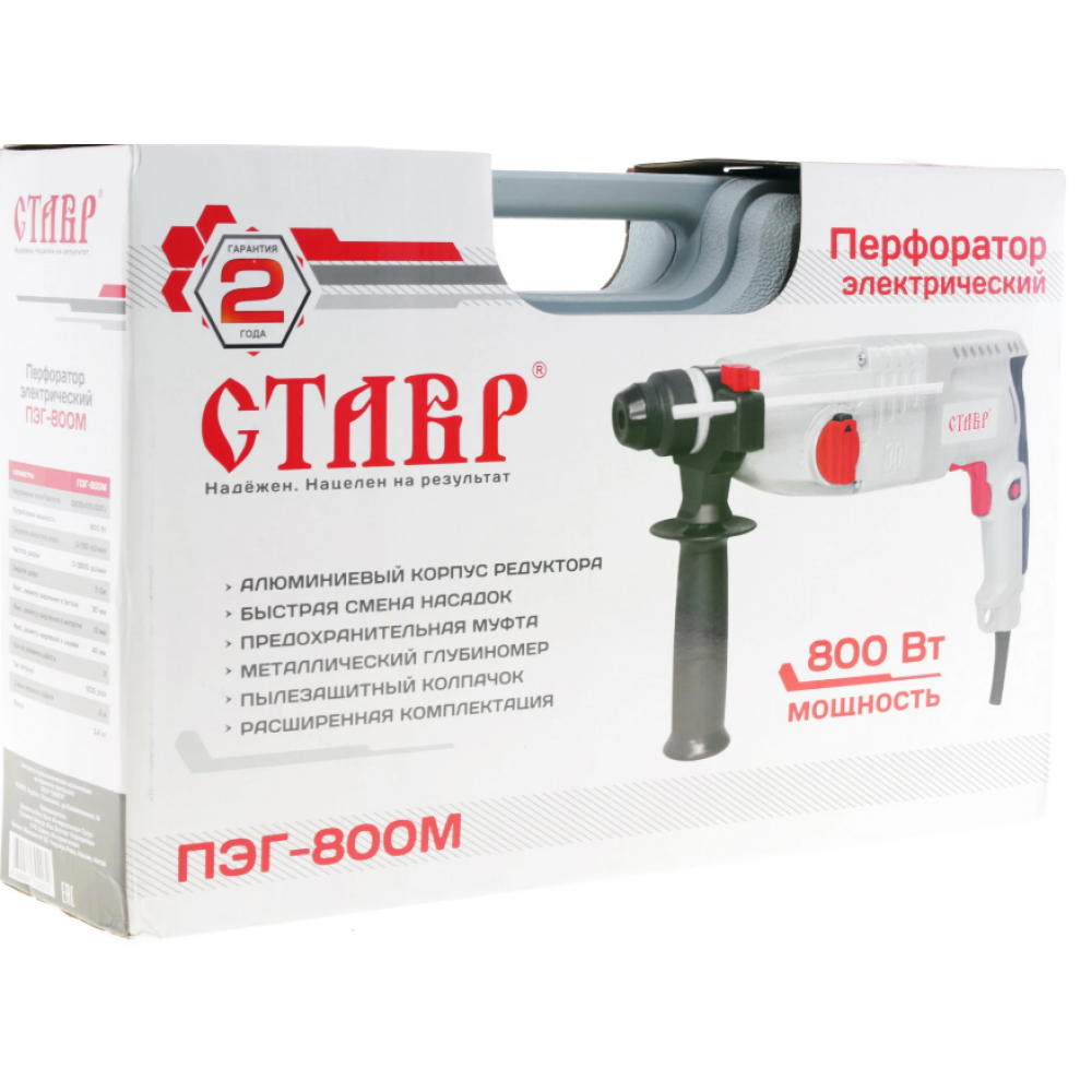 Перфоратор Ставр ПЭГ-800М работает в трех режимах – долбление, сверление и сверление с ударом в таких поверхностях как бетон, металл и дерево. Диаметр отверстий будет составлять 30, 13 и 40 мм соответственно. 800-ваттное устройство отличается скоростью в 3900 уд/мин и энергией удара в 3 Дж. Идущая в комплекте пика позволяет использовать перфоратор как отбойный молоток, а металлический глубиномер – точно отмерять высоту глухих отверстий. С пыльником вам не придется дышать строительной пылью, а внутренние детали Ставр ПЭГ-800М будут надежно защищены.