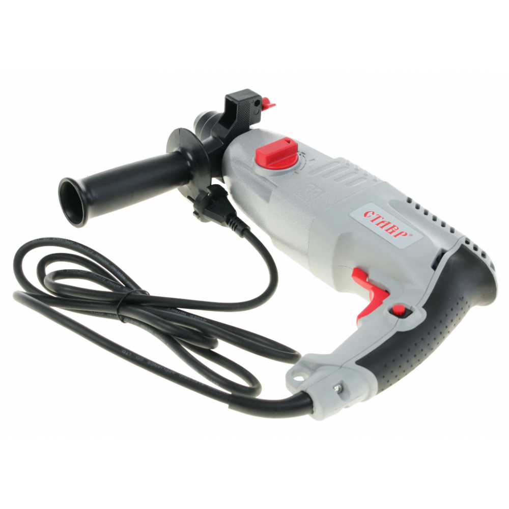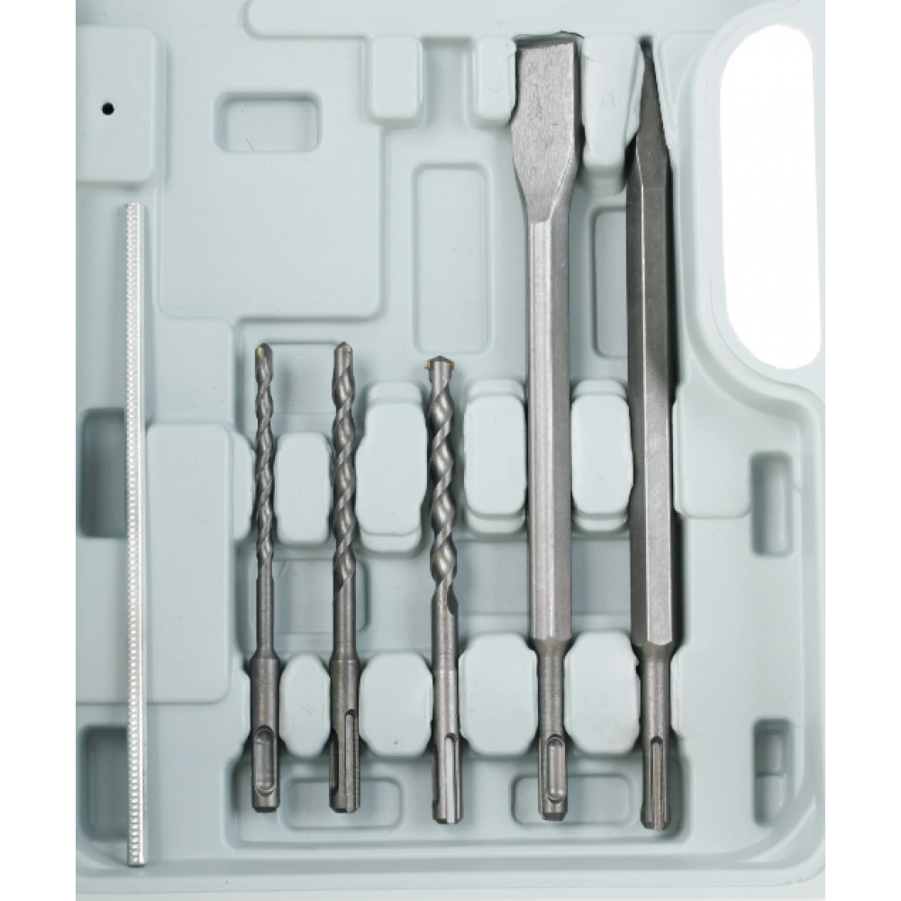 Угольные щетки и смазка, идущие в комплекте, делают обслуживание устройства проще. Также в комплекте идут 3 бура и кейс для хранения и транспортировки перфоратора. Инструмент весом в 3.4 кг удерживать в руках будет значительно удобней и безопасней благодаря дополнительной рукоятке эргономичной формы. Кнопка включения имеет блокиратор, так что устройство не включится при случайном нажатии на нее пальцами.