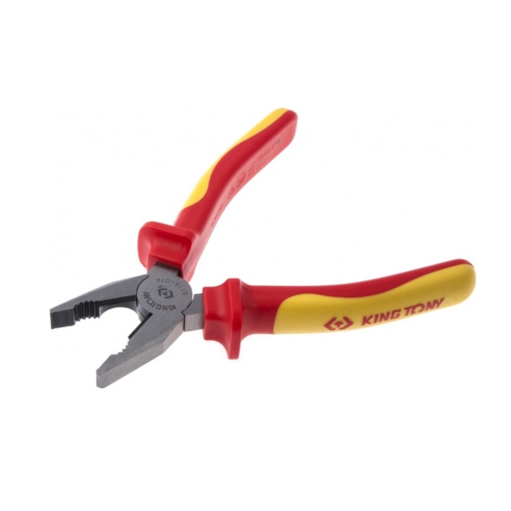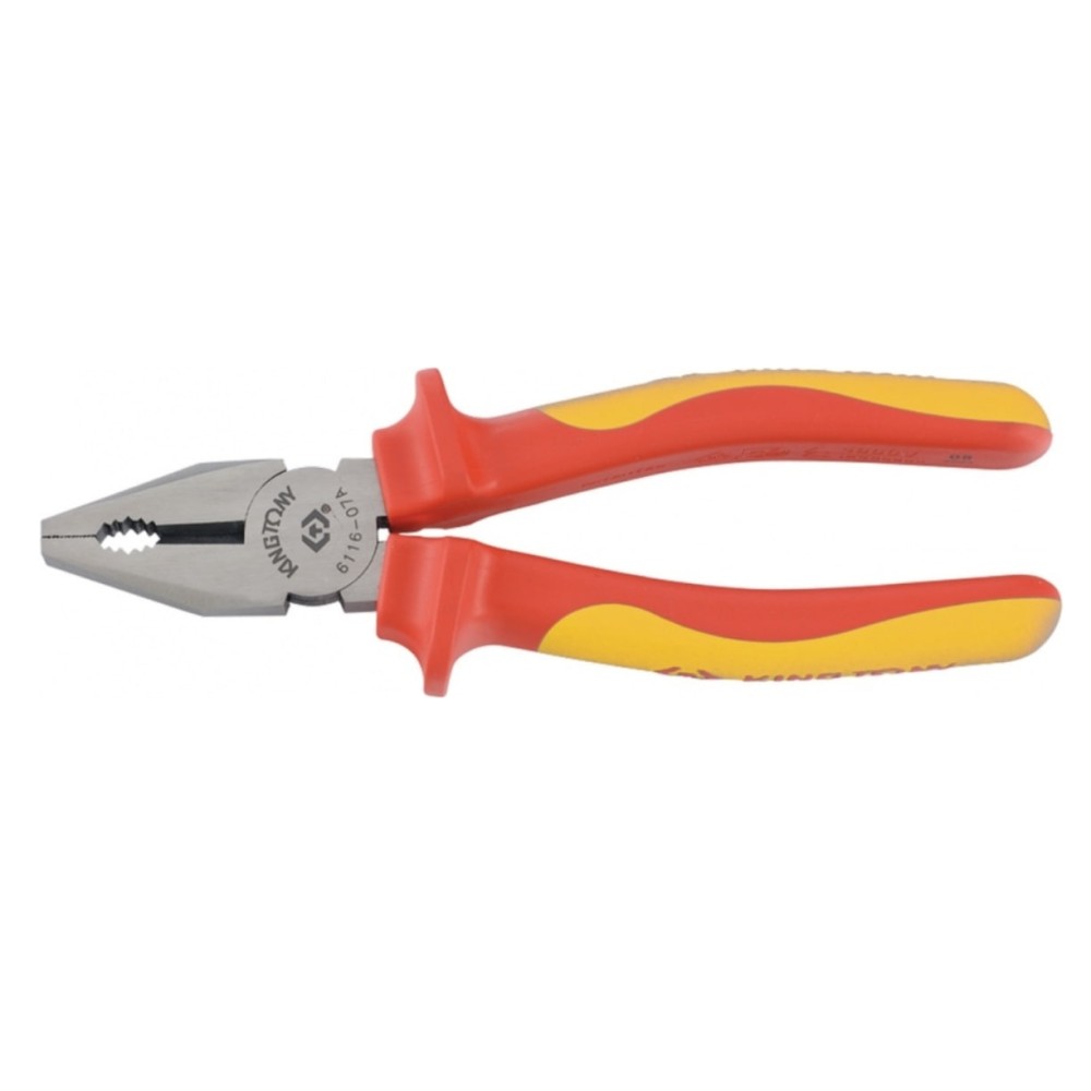 Плоскогубцы диэлектрические KING TONY 6116-07A длиной 185 мм предназначены для безопасной работы с электрическими установками под напряжением до 1000 В. Изготовлены из прочной хромованадиевой стали с хромированным покрытием, что обеспечивает высокую износостойкость и защиту от коррозии. Оснащены комбинированными губками — прямыми с полукруглой выемкой и встроенным резцом, что позволяет использовать инструмент как для захвата и удержания, так и для перекусывания проводов.