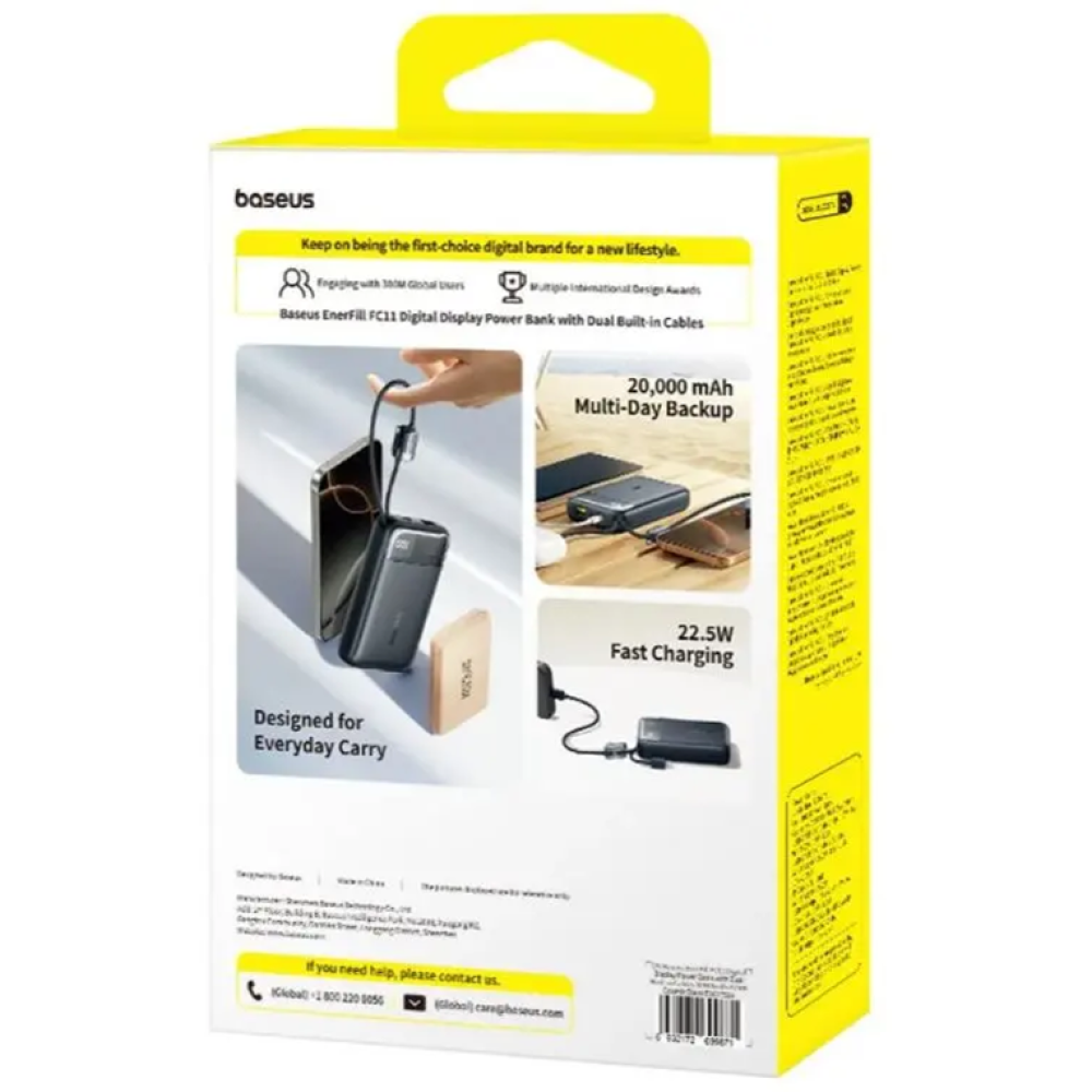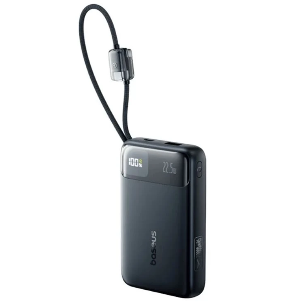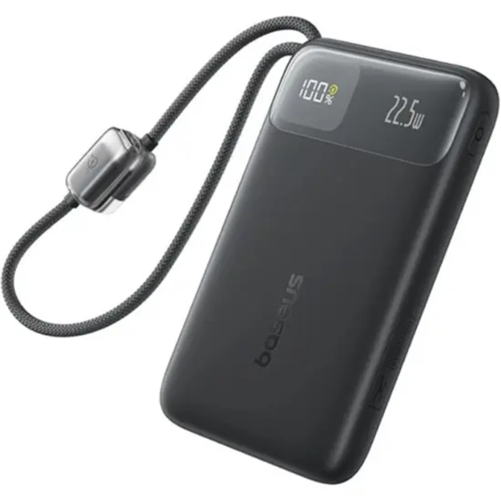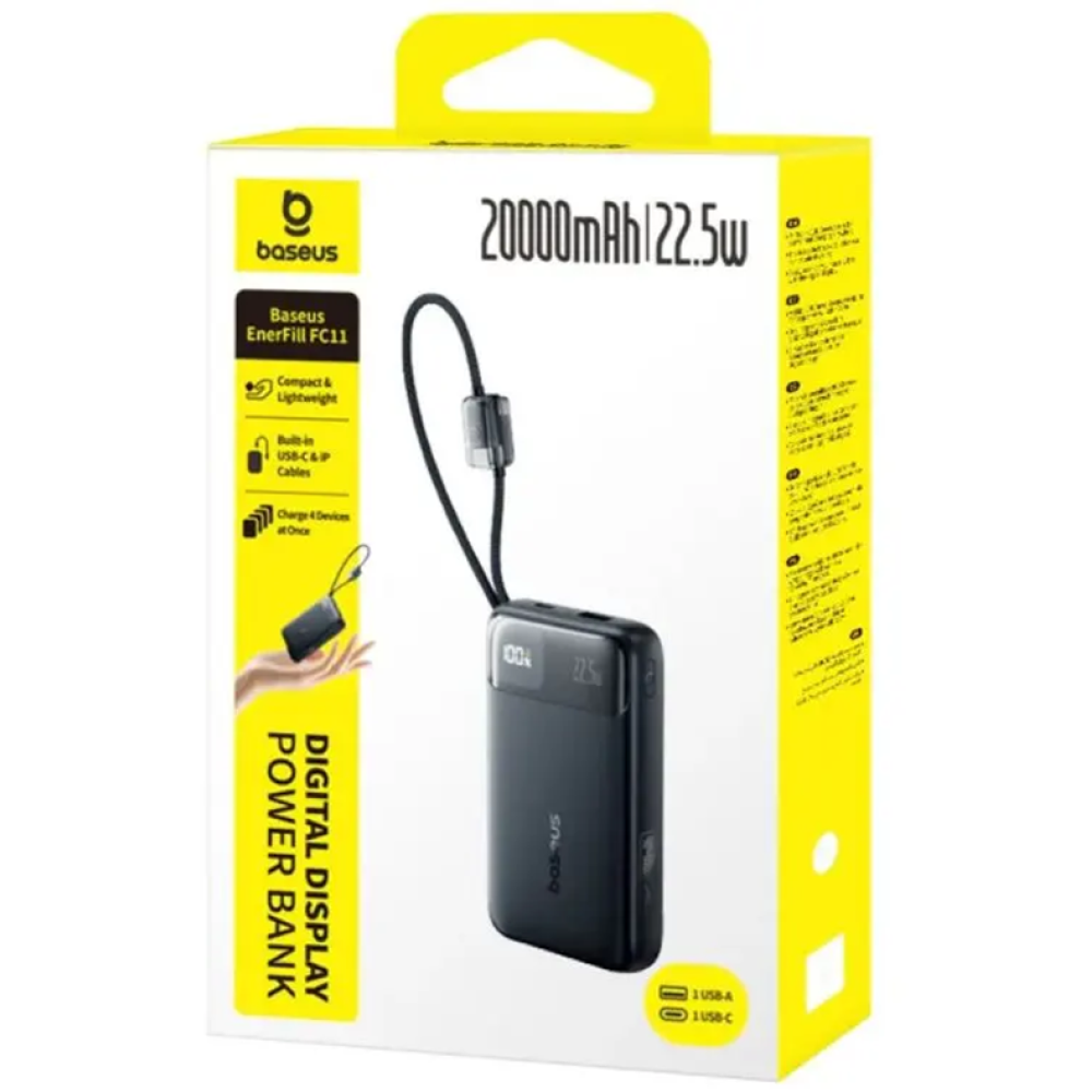 Внешний аккумулятор аккумулятор ёмкостью 20000 mAh с поддержкой быстрой зарядки до 22.5 W. Оснащён двумя встроенными кабелями USB-C и Lightning, а также портами USB-A и USB-C, что позволяет заряжать до 4 устройств одновременно.