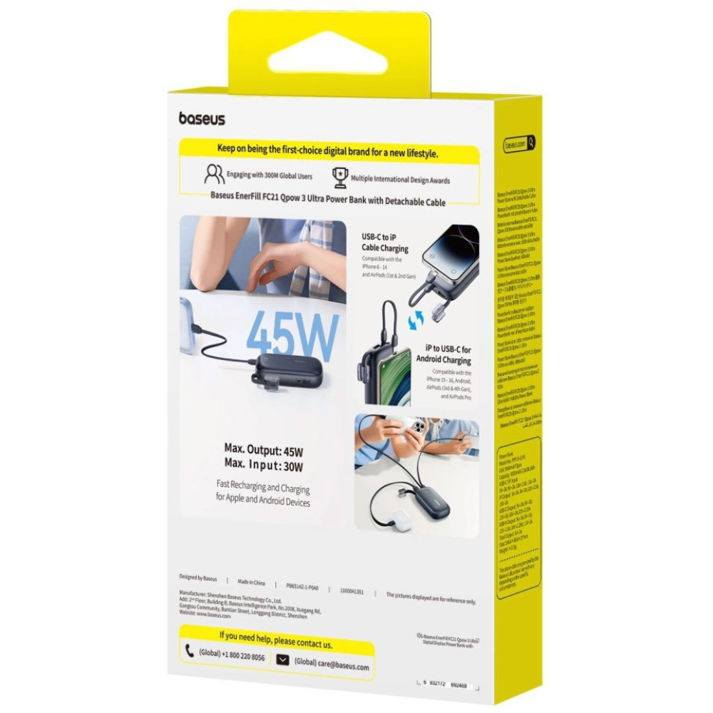 Компактный и мощный внешний аккумулятор ёмкостью 10000 mAh с поддержкой быстрой зарядки до 45 W. Оснащён отсоединяемым кабелем 2-в-1, цифровым дисплеем и поддержкой быстрой зарядки как Apple, так и Android-устройств. Подходит для смартфонов, планшетов и компактных ноутбуков.