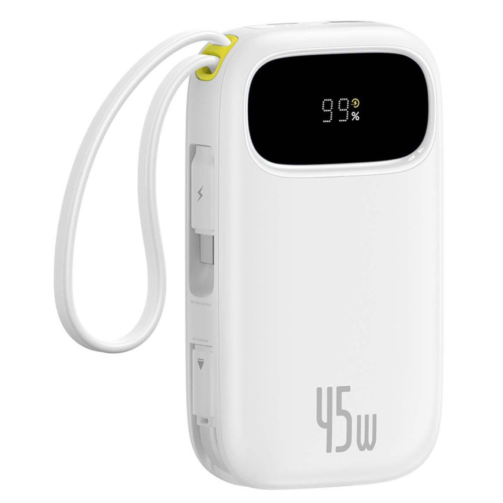 Компактный внешний аккумулятор Baseus серии EnerFill QPow 3 с ёмкостью 10000 mAh и поддержкой быстрой зарядки до 45W. Главная фишка – 2 встроенных кабеля USB-C и цифровой дисплей, чтобы заряжать устройства без поиска проводов и постоянно видеть остаток заряда.