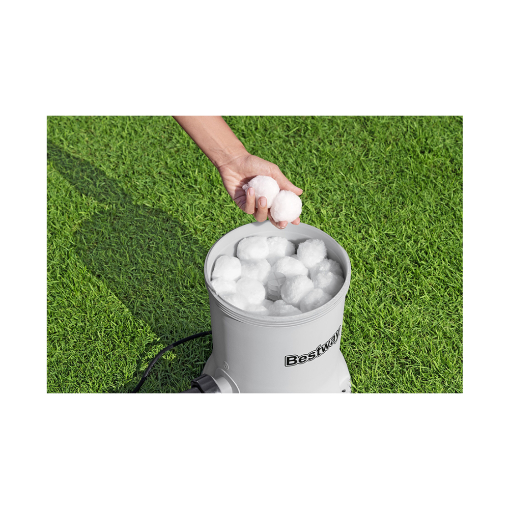 Используются фильтрующие шарики для бассейна Polysphere™. Шарики можно мыть (только вручную) и использовать повторно; они легкие и могут прослужить до 4–6 месяцев при правильном уходе