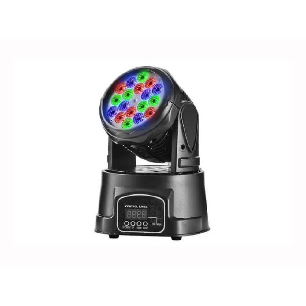 Динамический световой прибор - LED Beam: 3W LED 18 PCS RGBW, Ресурс работы источников света 60 000 часов. Угол луча 25 градусов. Каналы DMX: 7/12, режим звуковой активации. Pan: 540° / 180º. Tilt: 180° / 90º.