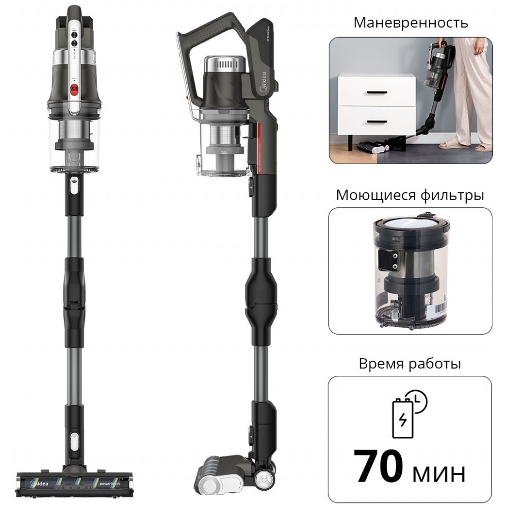 Midea P7 Flex – это беспроводной вертикальный пылесос с циклонной системой. При своей внушительной мощности 450 Вт, пылесос способен проработать до 70 мин на одном заряде.