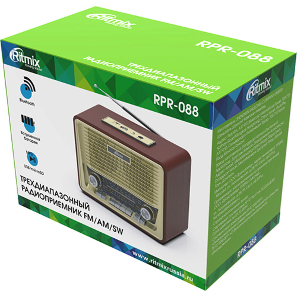 Радиоприемник Ritmix RPR-088 представлен в компактном золотом корпусе. Устройство способно принимать сигналы FM и AM с аналоговой настройкой частоты. Стереосистема также поддерживает возможность воспроизведения MP3-файлов. Прибор оснащен устройством для чтения microSD-карт, входом AUX, USB-портом и модулем Bluetooth.