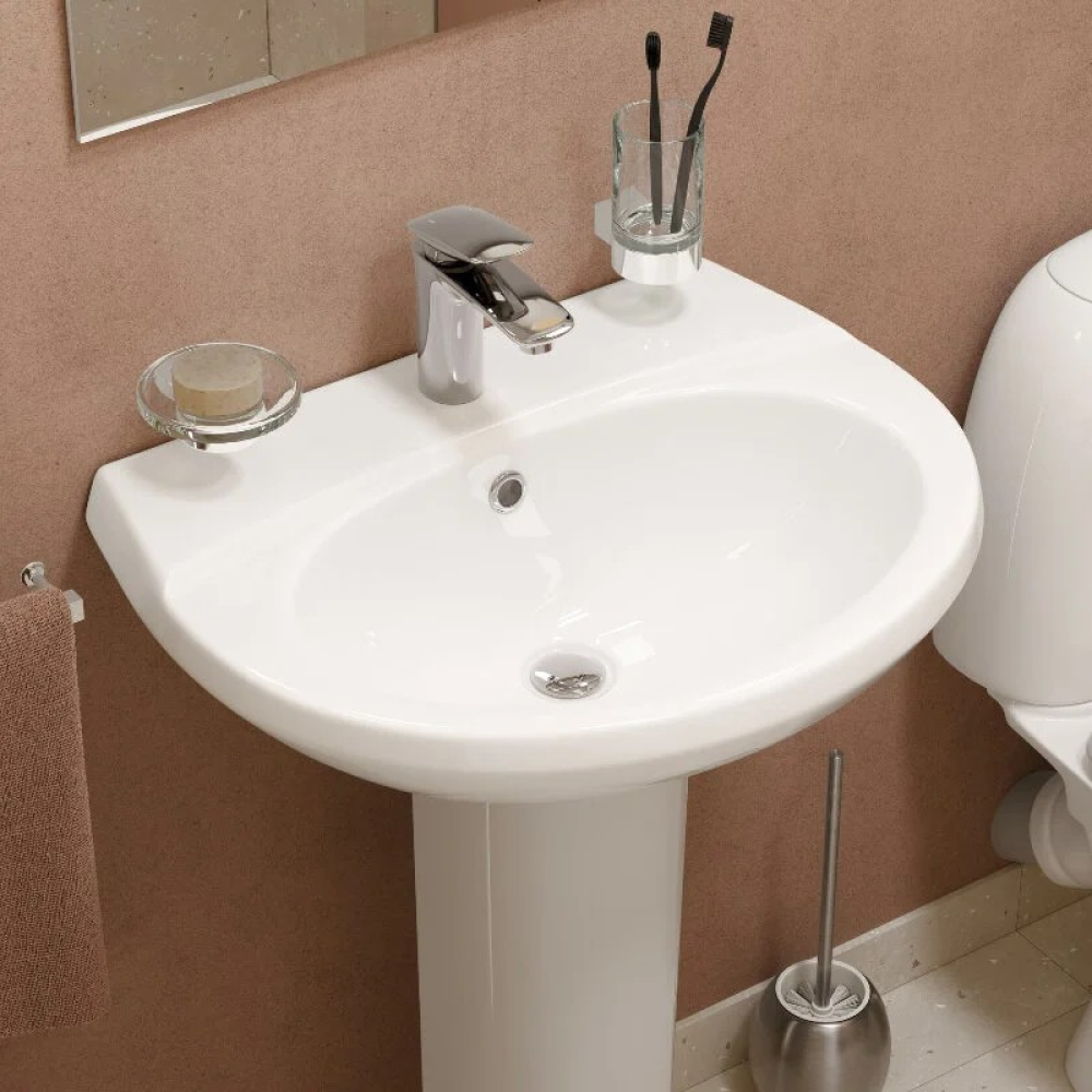 Подвесной умывальник на пьедестале, широкая полочка, центральное отверстие под смеситель, есть перелив, коммуникации скрываются пьедесталом