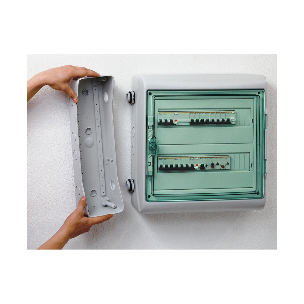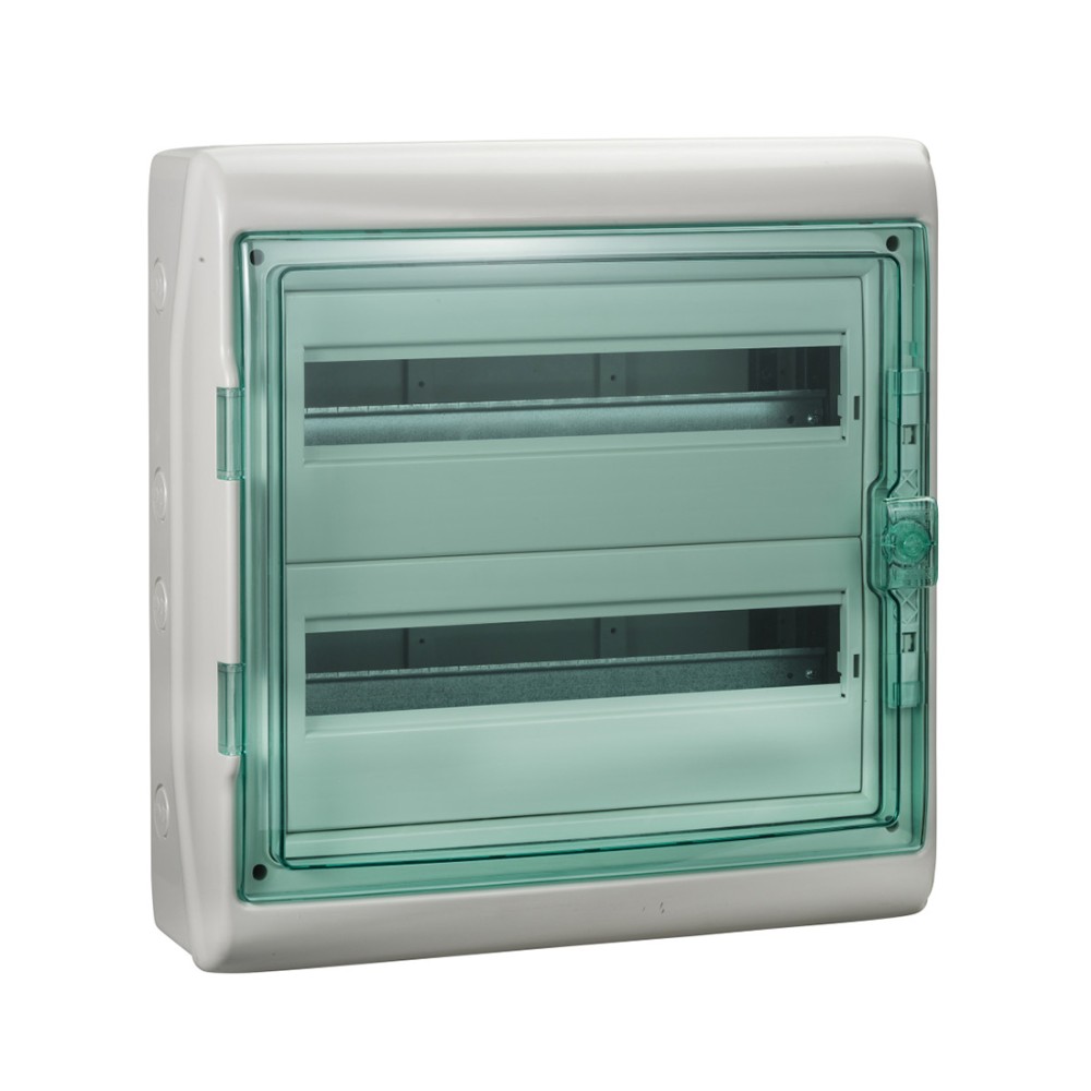 Этот защищенный от атмосферных воздействий щит Mureva представляет собой щит для модульного устройства, устанавливаемый на поверхности. Состоит из 2 рядов по 18 модулей по 18 мм. Может применяться ко всем типам модульных распределительных устройств. Степень защиты IP - 65. Этот щит предназначен для водонепроницаемой установки внутри или снаружи помещений. Он оснащен прозрачной зеленой дверью. Цвет корпуса - светло-серый (RAL 7035). Он предназначен для установки в жилых домах, небольших зданиях и на промышленных объектах. Кабели могут быть введены сверху или снизу шкафа с помощью 17 предварительно вырезанных отверстий. Он оснащен задней панелью и передней крышкой с вырезом. Он поставляется с DIN-рейкой. Он поставляется с 1 клеммным блоком с 32 отводами (16x10mm² + 16x16mm²). Комплект маркировки также поставляется внутри изделия. Класс электрической изоляции - класс II (двойная изоляция). Категория перенапряжения - класс II. Рассеиваемая мощность составляет 47 Вт. Номинальный ток In составляет до 90 А. Данное изделие соответствует требованиям стандарта IEC 61439-3. Размеры (Ш) 448 мм x (В) 460 мм x (Г) 160 мм. Материал представляет собой самозатухающий полимерный материал. Его сопротивляемость пламени и аномальному нагреву составляет 650°C согласно IEC 60695-2-1. Устойчив к воздействию ультрафиолетового излучения. Степень защиты IK составляет IK09. Температура эксплуатации от -25°C до 60°C.