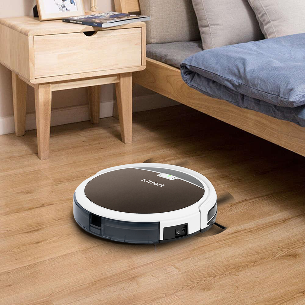 Робот-пылесос Кіtfort КТ-519-4 принадлежит к новой серии роботов-пылесосов. Он вобрал в себя все современные наработки: уменьшенные высоту и диаметр корпуса, увеличенный объём пылесборника, литиевый аккумулятор, НЕРА-фильтр и бесщёточный мотор. Высота пылесоса составляет всего 8 см, благодаря чему он может пройти под большинством шкафов и кроватей. Уменьшенный диаметр корпуса дает возможность протиснуться между близко расположенными препятствиями и убрать больше поверхности пола. Пылесос оснащён турбощёткой, поэтому он хорошо подходит для уборки ковровых покрытий, особенно, если в доме есть домашние животные. Турбощётка имеет быстросъёмное крепление и легко снимается! Во время чистки ковра турбощётка сначала приподнимает ворс, а затем выметает из него мусор. На твёрдой поверхности вращающаяся турбощётка заметает мусор прямо в контейнер. Это позволяет без особых усилий собирать крупный или тяжелый мусор. Запрограммируйте робота, определив график, и пылесос в ваше отсутствие уберёт во всех помещениях. В комплекте прилагается база для автоматической подзарядки пылесоса. Если заряд аккумулятора закончился, пылесос сам разыщет базу и встанет на зарядку. В комплекте всё необходимое для уборки: пылесборник, боковые щётки, пульт ДУ, фильтр грубой, промежуточной и тонкой очистки, база, зарядное устройство, а также запасные щётки и фильтр тонкой очистки.