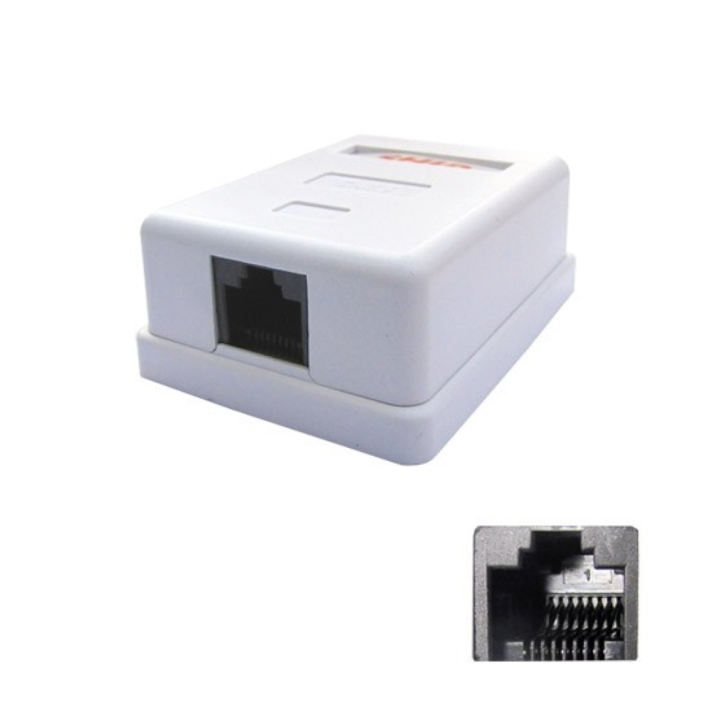 Для внешнего монтажа. Корпус настенной розетки состоит из основания и крышки. Конструкция выполнена из высококачественного пластика. Внутри расположен модуль RJ-45, UTP, стандарта категории 6. Крепёжные элементы для монтажа включены в комплект. Корпус крепится к поверхности при помощи двух винтов и шурупов.