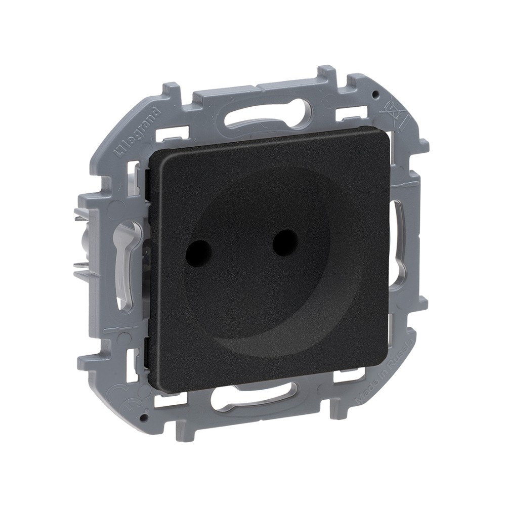 Розетка без заземления Legrand Inspiria для скрытого монтажа , цвет "Антрацит". Максимальный ток 16 А, напряжение ~250В, максимальная мощность 3680 Вт. Применяется для электропитания в зданиях с проводкой без заземления (без защитного проводника).