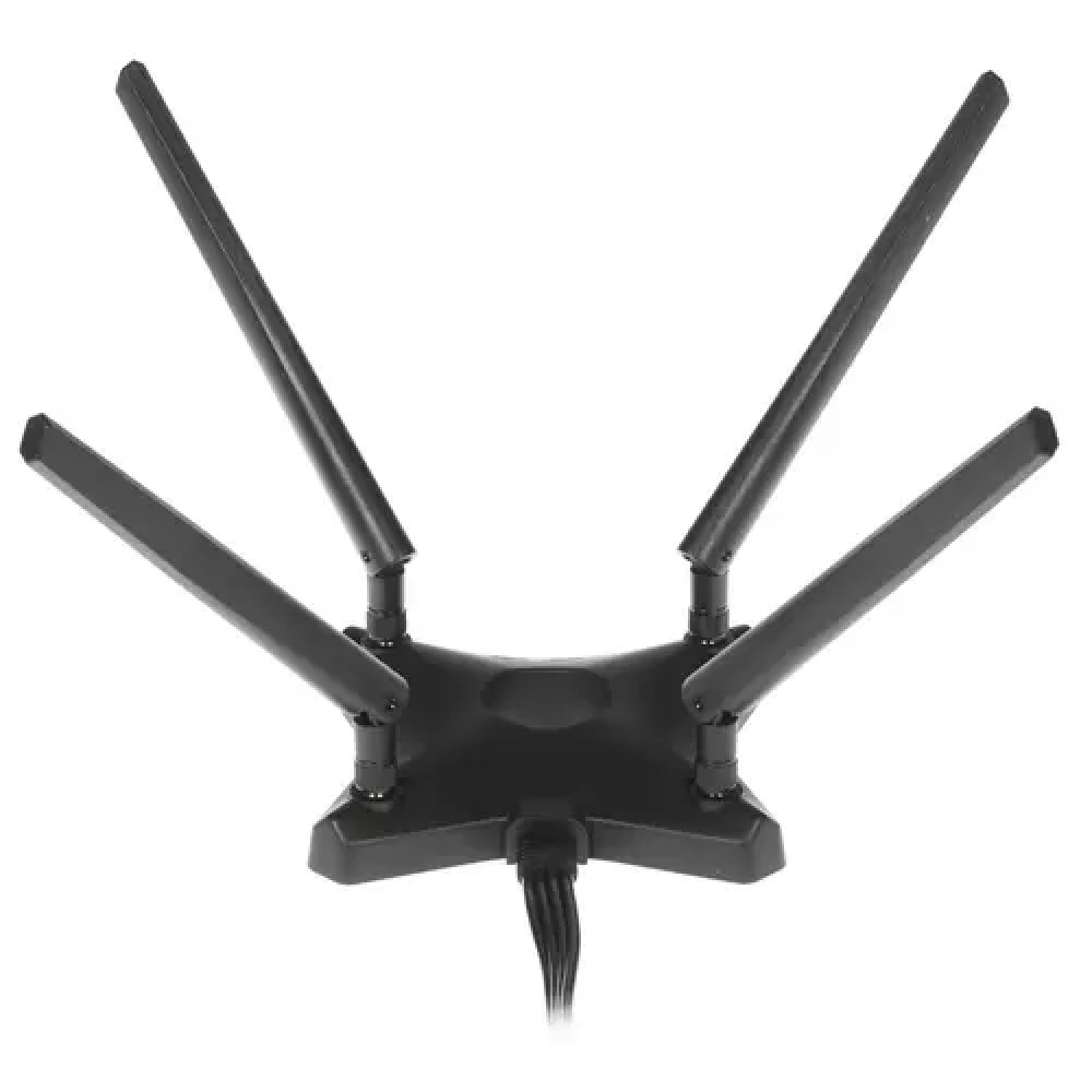 Wi-Fi-адаптер ASUS PCE-AC88 с общей пропускной способностью до 3167 МБит в секунду по диапазонам 2.4 и 5 ГГц является интегрированным решением для подключения стационарного ПК к беспроводной сети передачи данных. Технически устройство состоит из встраиваемого в корпус системного блока модуля с интерфейсом подключения PCI-E и выносного блока с наружными съемными антеннами. Такое решение дает возможность расположить антенны на компьютерном корпусе наиболее оптимальным образом.