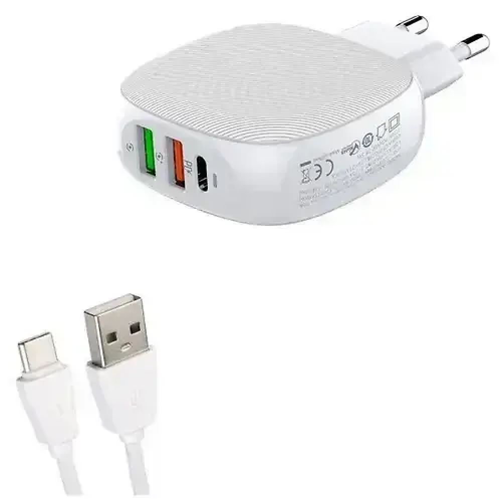 Сетевое зарядное устройство LDNIO A3510Q - это стильная и качественная зарядка для мобильных устройств. Устройство оснащено тремя USB выходами: 2 USB TYPE-A и USB TYPE-C. USB TYPE-A поддерживает функцию быстрой зарядки QC 3.0, а USB TYPE-C - стандарт быстрой зарядки PD, что, к примеру, позволяет зарядить iPhone до 50% всего за полчаса (при поддержке протокола iPhone PD quick charge). Входное напряжение - от 100 до 240 В. Выходные параметры: 3,6-6 В - 3А/ 9В - 2A/ 12В - 1,5A. Выходы USB TYPE-A и USB TYPE-C могут отдавать энергию одновременно: максимальная мощность - 28,5 Вт. LDNIO A3510Q имеет многоуровневую защиту: от повышенного тока, от повышенного напряжения, от перегрева. Корпус адаптера изготовлен из высококачественного негорючего пластика (до 750 C). Важной отличительной чертой продукции Ldnio является то, что в комплекте с зарядным устройством идет кабель длиной 1 м с нужным вам разъемом: Type-C, Micro, Lightning или PD - вам нужно только выбрать соответствующую комплектацию!