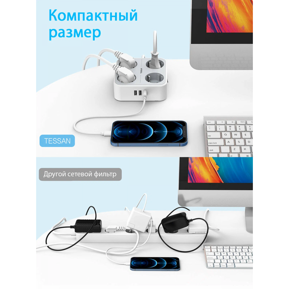 Компактный сетевой фильтр Tessan TS-302-C с 4 розетками, 2 USB-A и 1 USB Type-C — идеален для дома, офиса и путешествий. Позволяет одновременно подключать технику и заряжать гаджеты, включая современные устройства с USB-C. Кабель длиной 2 м, корпус выполнен в сером цвете. Оснащён защитой от перегрузки, короткого замыкания и перенапряжения. Имеет общий выключатель и индикатор питания.
