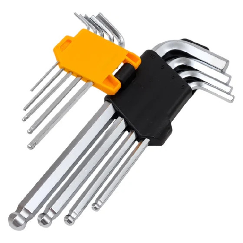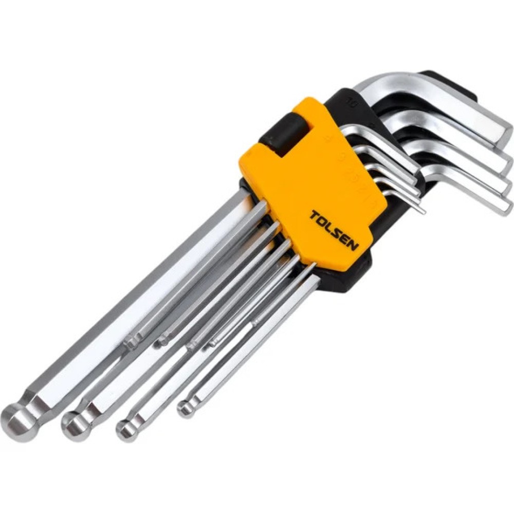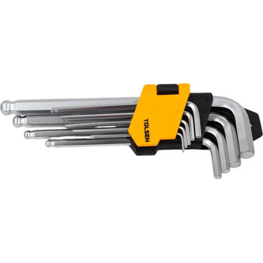 Набор шестигранных ключей TOLSEN 20053 включает 9 удлинённых G-образных ключей с шаровым наконечником, предназначенных для работы с крепёжными элементами с внутренним шестигранным шлицем.