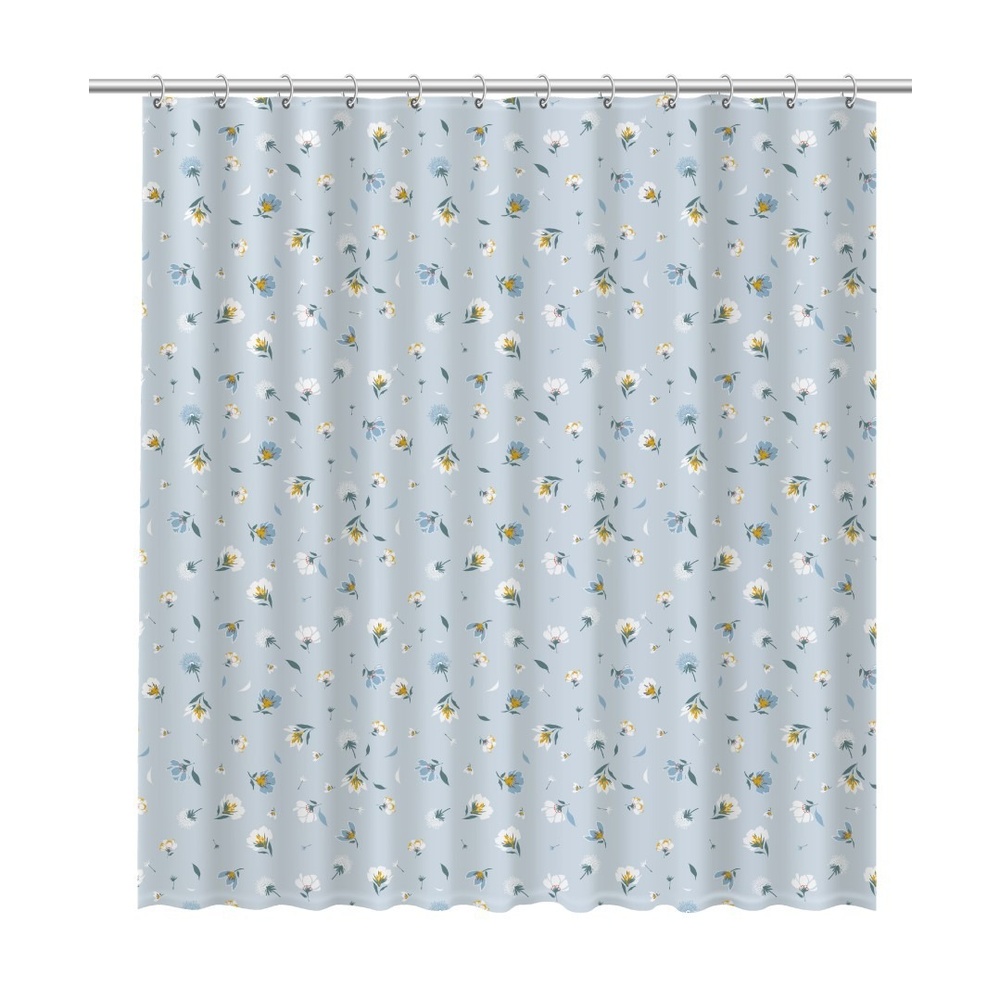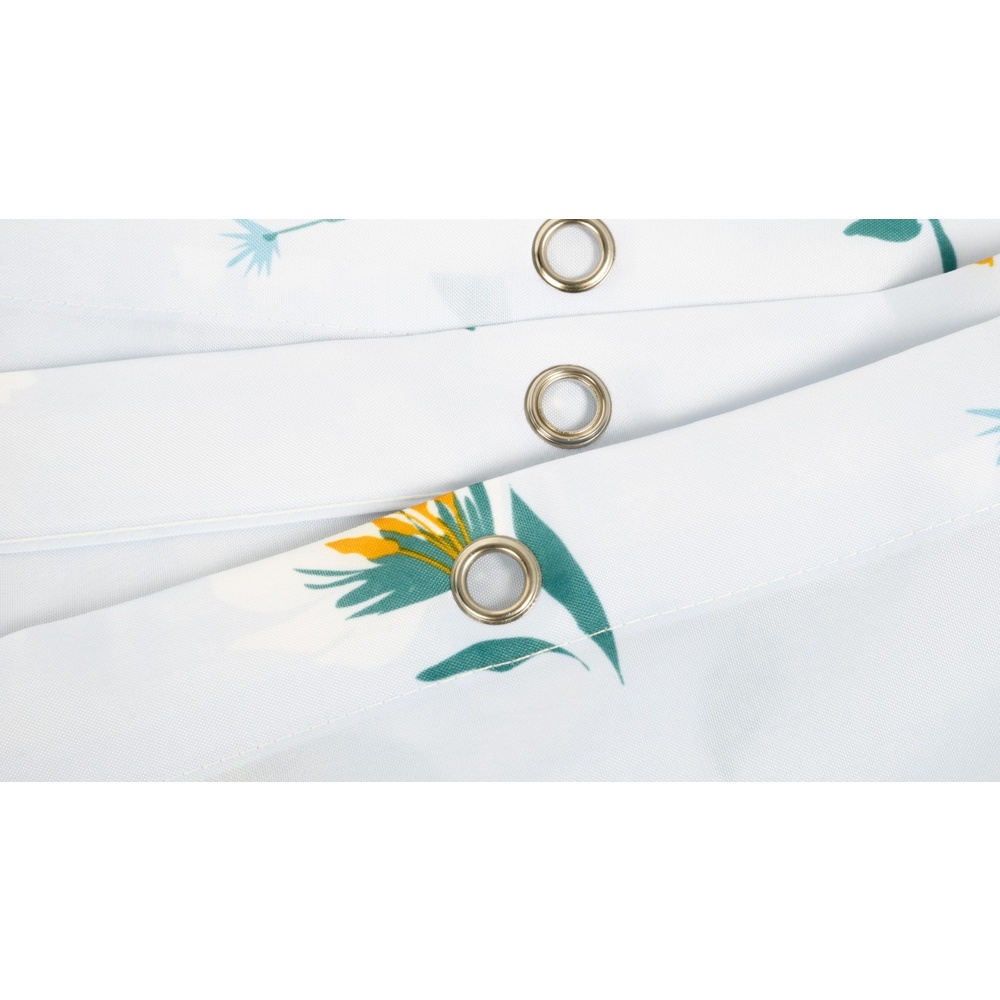 Штора изготовлена из 100 % полиэстера с водоотталкивающей пропиткой. Плотность ткани — 100 г/м². Оснащена 12 металлическими люверсами Ø 10 мм и резиновым утяжелителем. Крепление навесное на штангу/карниз через люверсы; кольца в комплект не входят. Цвет — голубой с цветочным принтом, дизайн в стиле «сад»