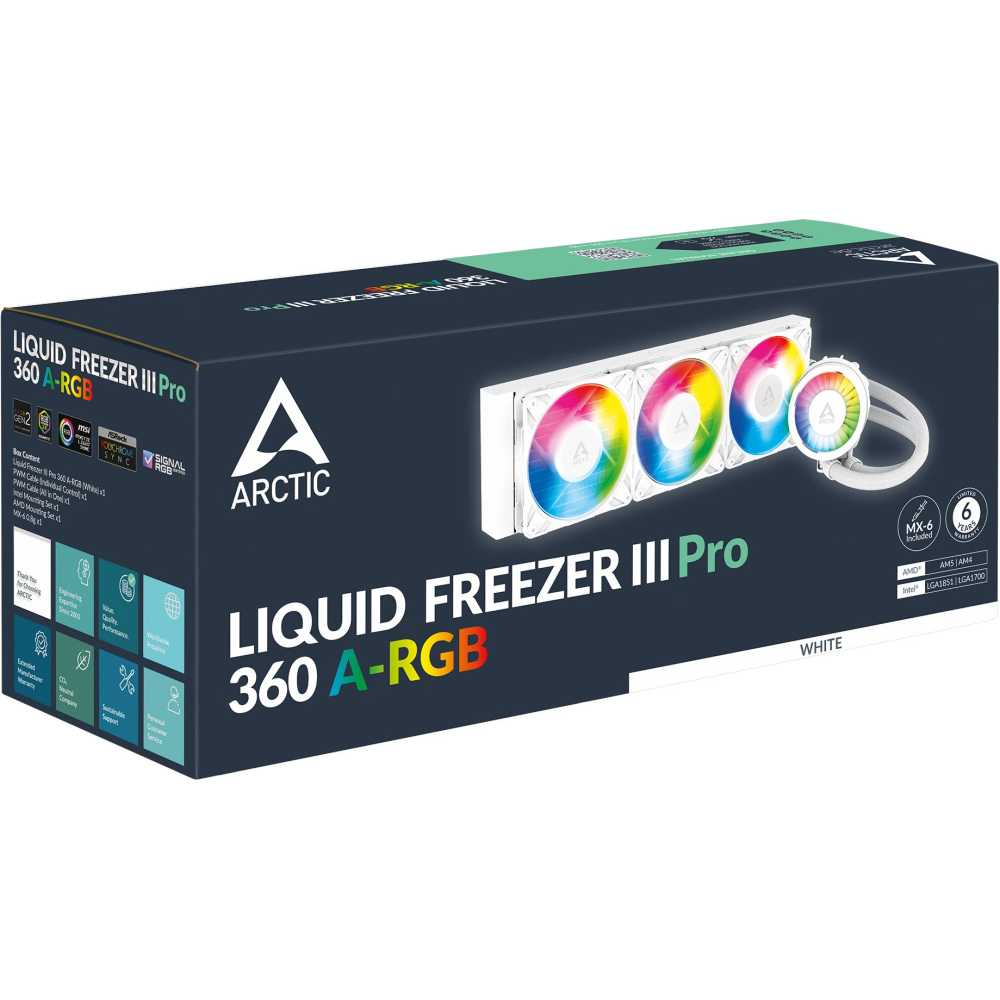 Liquid Freezer III Pro 360 A-RGB White — это мощная, тихая и мультисовместимая система жидкостного охлаждения для процессоров, сочетающая передовые технологии и удобство монтажа. Система оснащена вентиляторами P12 Pro, которые обеспечивают высокую эффективность на всех скоростях: при низких оборотах работают практически бесшумно, сохраняя отличное охлаждение, а под нагрузкой раскрывают свой полный потенциал, гарантируя максимальный теплоотвод. Увеличенный 38-мм радиатор не только улучшает рассеивание тепла, но и за счёт большего объёма жидкости снижает тепловую инерцию, эффективно справляясь даже с резкими скачками температуры процессора. Для стабильности системы предусмотрен встроенный PWM-вентилятор, охлаждающий цепь питания VRM, что предотвращает перегрев и обеспечивает бесперебойную работу даже под нагрузкой. Инновационное крепление со смещением для Intel и AMD оптимизирует положение холодной пластины, точно попадая в зону максимального нагрева CPU, а фирменная контактная рамка Intel обеспечивает равномерное давление на процессор, улучшая теплоотвод и продлевая срок его службы.