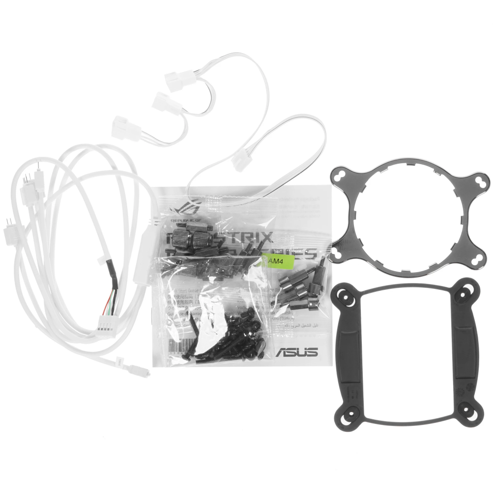 Используемые в процессорной СВО ASUS ROG Strix LC 360 RGB White Edition вентиляторы (3 шт.) размером 120x120 мм поддерживают вращение со скоростью 800-2000 об/мин, отличаясь наибольшей шумностью 37.6 дБ. Присоединение водяной помпы данной системы охлаждения производится к коннектору питания 4-pin. Водоблок и радиатор связаны между собой непрозрачным шлангом для жидкого теплоносителя длиной 380 мм.