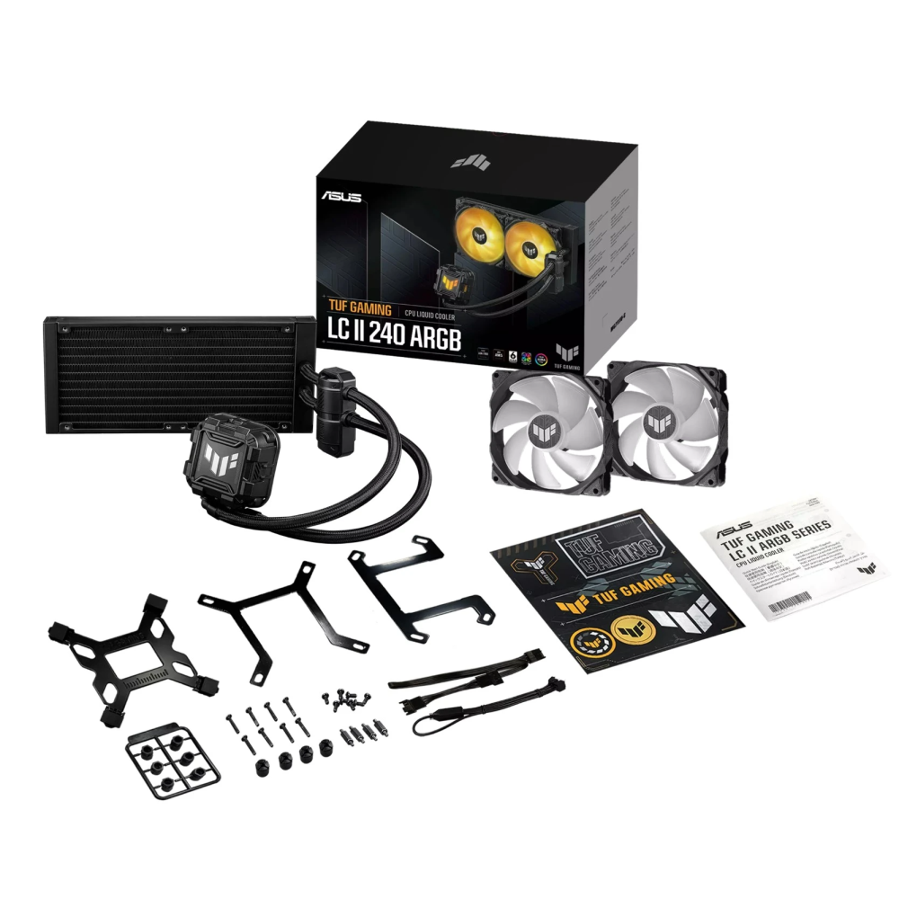 TUF Gaming LC 240 ARGB: необслуживаемая система водяного охлаждения процессора с синхронизируемой адресуемой подсветкой Aura и двумя 120-миллиметровыми вентиляторами на радиаторе.
