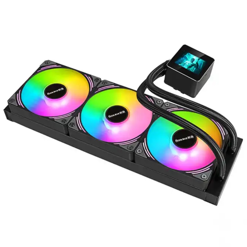 Huntkey MVP V360 — это мощная жидкостная система охлаждения с радиатором на 360 мм, предназначенная для эффективного охлаждения современных процессоров. В комплекте — три 120-мм вентилятора с ARGB-подсветкой, обеспечивающей не только производительность, но и эффектный внешний вид. Модель совместима с большинством современных сокетов Intel и AMD, обладает низким уровнем шума и надёжной конструкцией. Отличается удобством установки и возможностью синхронизации подсветки с другими компонентами ПК.