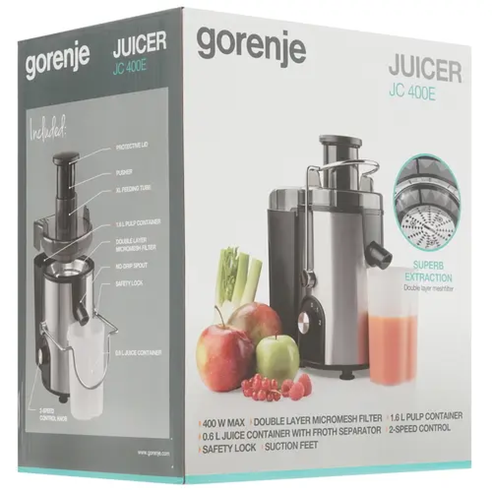 Соковыжималка Gorenje JC400E оснащена фильтром из нержавеющей стали с особой конструкцией, который измельчает продукты и выжимает из них максимальное количество сока. Жмых автоматически собирается в отдельном контейнере, а сок подается в емкость через носик. Два скоростных режима позволяют регулировать интенсивность переработки в зависимости от твердости овощей и фруктов.