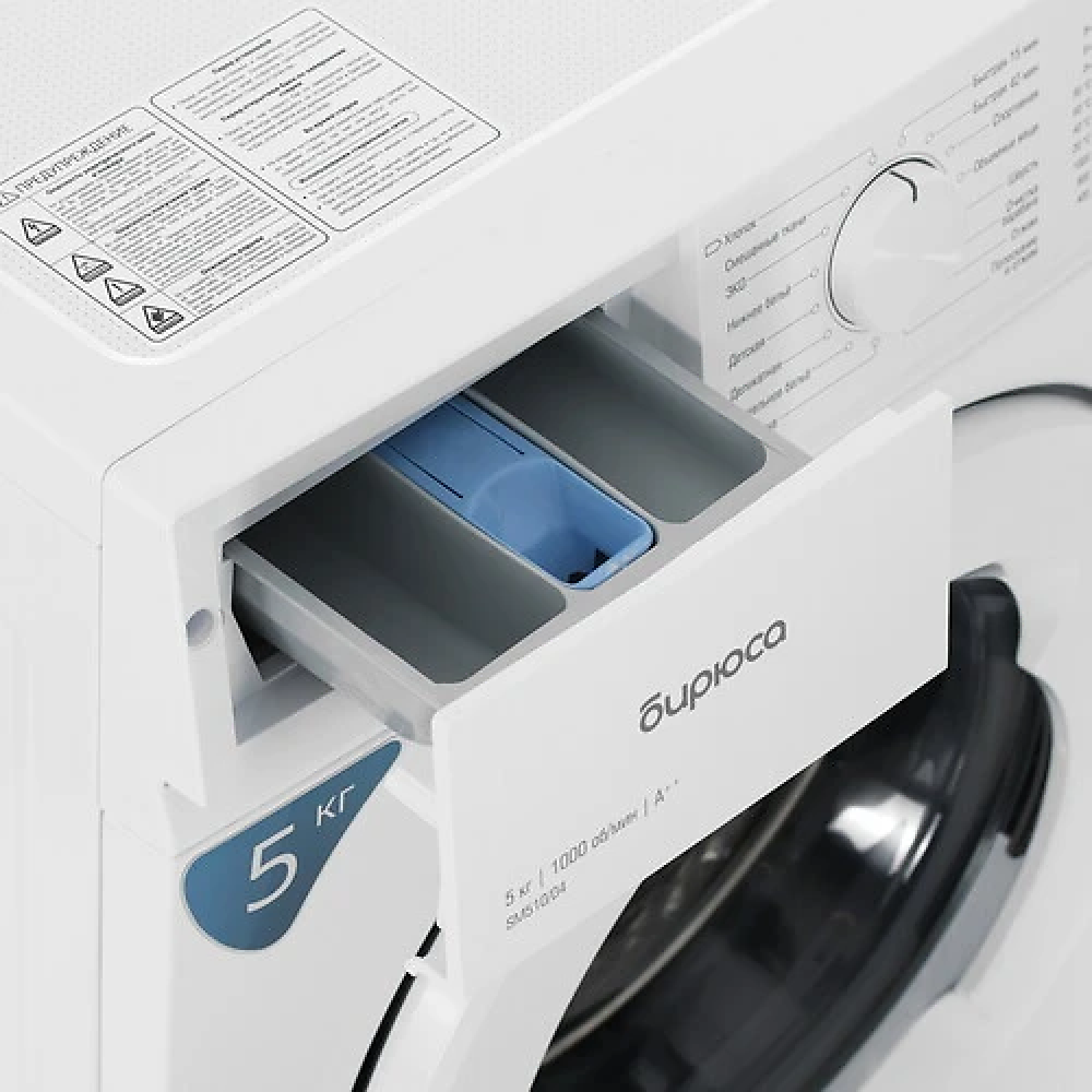 Бирюса WM-SM510/04 с фронтальной загрузкой на 5 кг приступает к работе в выбранный временной интервал. Достаточно воспользоваться режимом отложенного запуска, рассчитанным на 18 ч. Окончание цикла очистки сопровождается звуковым сигналом. Ограничить доступ к функционалу можно с помощью кнопки «Блокировка».