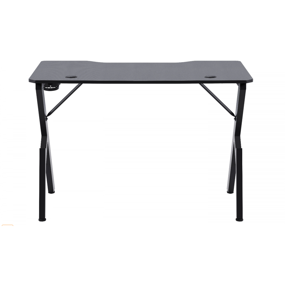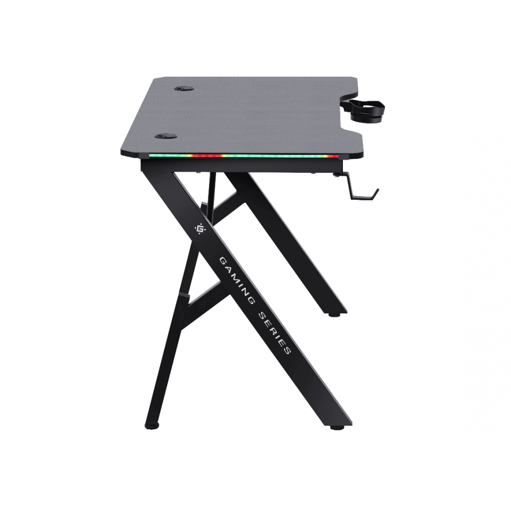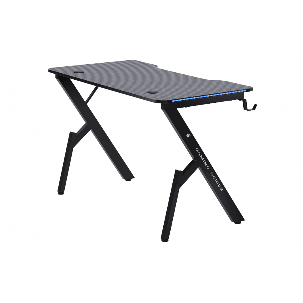 Игровой стол DEFENDER Ino подвес кружка + гарнитура, черный, МДФ, RGB 64074 с RGB подсветкой и с прочными металлическими ножками. Столешница выполнена из МДФ и покрыта прочной меламиновой пленкой с текстурой под карбон. В комплект входят держатели для гарнитуры и кружки, в столешнице предусмотрены 2 выхода для проводов. Длина столешницы 110 см.