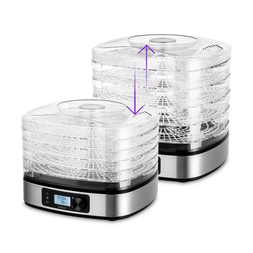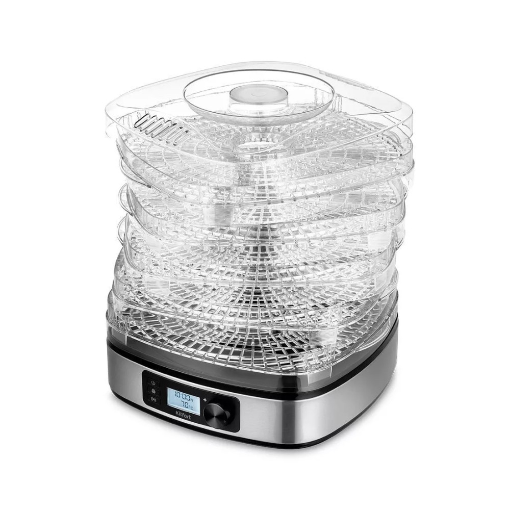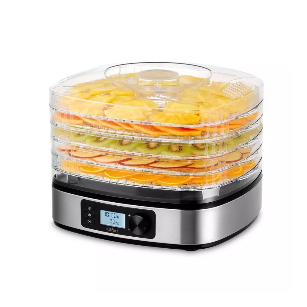 Сушилка для овощей и фруктов Kitfort КТ-1943 сохранит любимые фрукты и овощи полезными круглый год! Прибор насушит на всю зиму помидоры, кабачки, баклажаны, клубнику, абрикосы, персики, тыкву, грибы, зелень, а также хлеб.