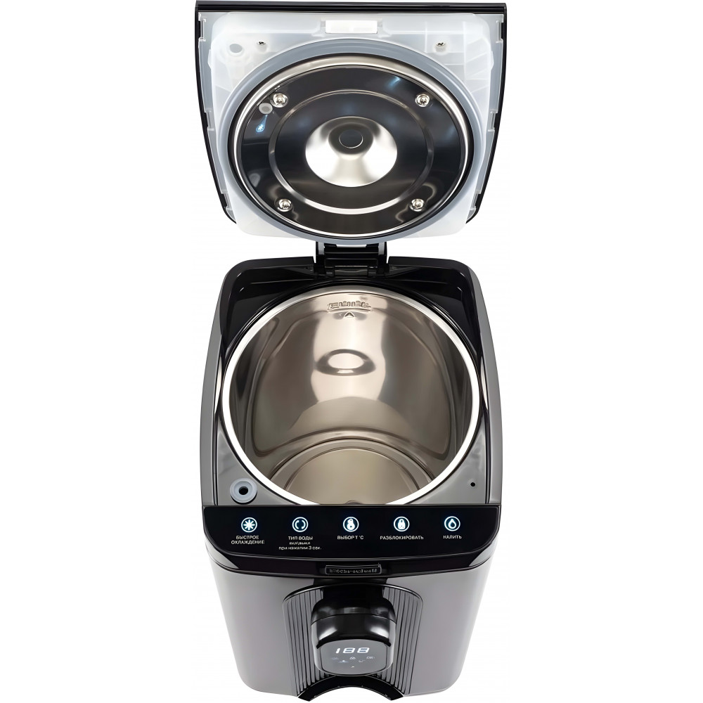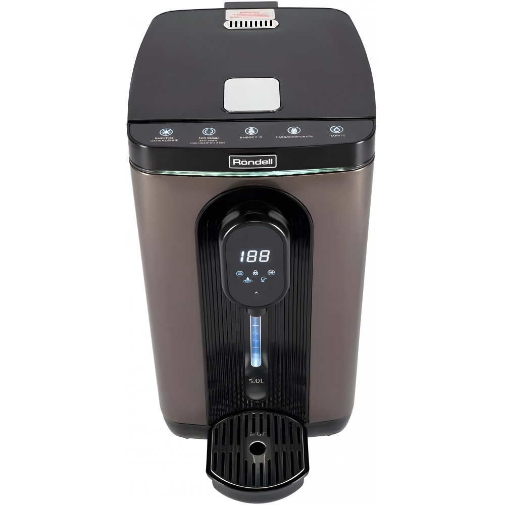 Термопот Rondell RDE-1051 — современное устройство с объёмом 5 литров и мощностью 850 Вт, оснащённое автоматическим насосом и ЖК-дисплеем. Поддерживает 13 температурных режимов от 45 до 100 °C, а также функции повторного кипячения и дехлорирования. Корпус и колба выполнены из нержавеющей стали, предусмотрены защита от перегрева, блокировка включения без воды и детский замок.