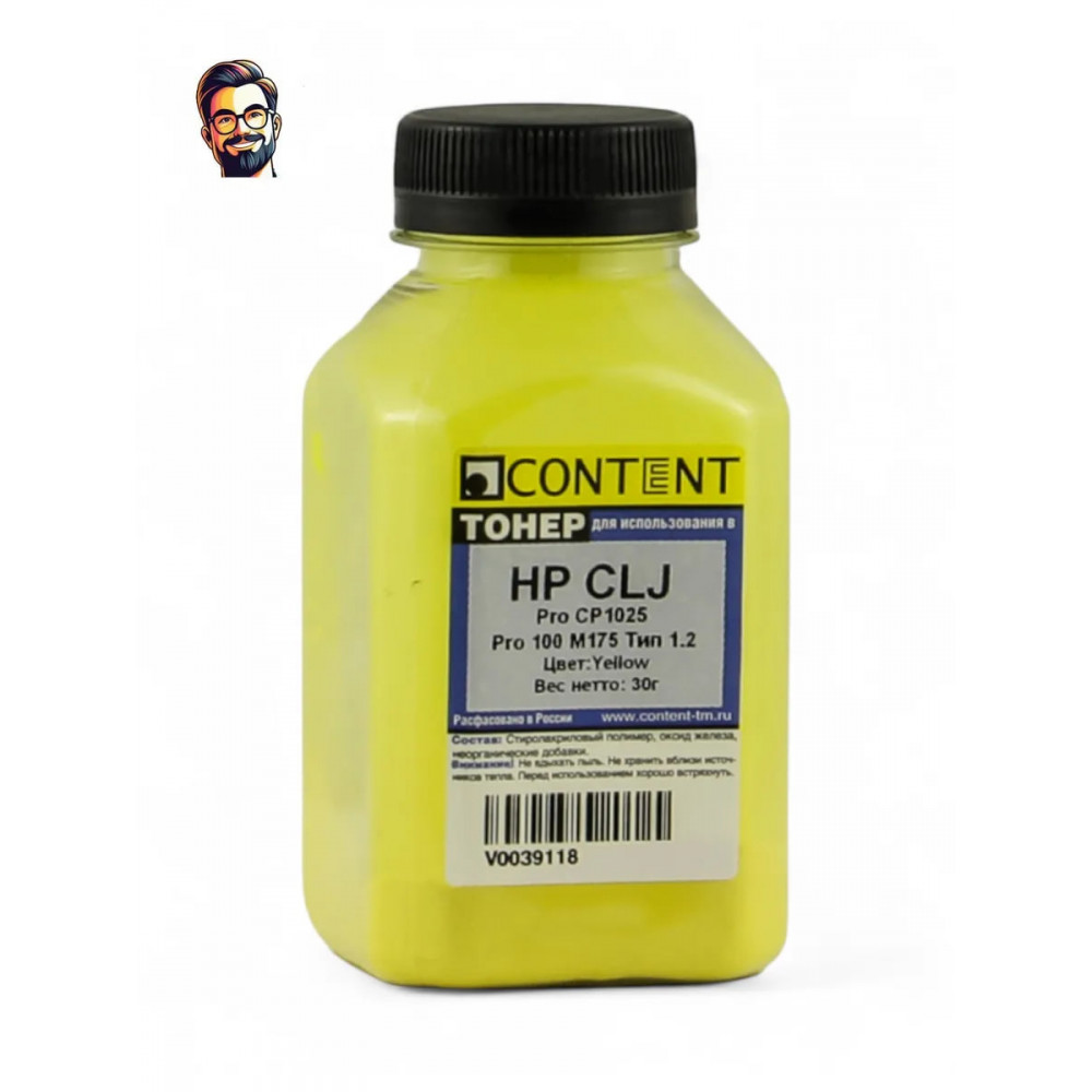 Тонер Content для HP CLJ Pro CP1025/Pro 100 M175, Тип 1.2, Yellow (Y), 30 г, банка — качественный расходный материал, предназначенный для заправки цветных лазерных картриджей принтеров HP серии Color LaserJet Pro. Тонер жёлтого цвета обеспечивает яркую, насыщенную и равномерную передачу оттенков, что позволяет получать чёткие и контрастные отпечатки как при печати текста, так и графических материалов. Формула тонера типа 1.2 оптимизирована для стабильной работы устройства, предотвращает появление фона, обеспечивает равномерное распределение порошка и качественное закрепление на бумаге. Объём 30 грамм рассчитан на одну полноценную заправку картриджа, что позволяет восстановить ресурс печати и снизить затраты на обслуживание оборудования. Тонер подходит для использования с принтерами HP Color LaserJet Pro CP1025/CP1025nw и HP LaserJet Pro 100 Color MFP M175a/M175nw/M275, а также совместим с картриджами CE312A и CF352A. Упаковка в прочной пластиковой банке обеспечивает удобство хранения и защиты тонера от влаги.