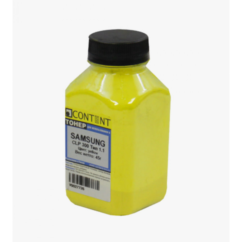 Тонер Content для Samsung CLP-300, Тип 1.1, жёлтый (Y), 45 г, банка — это высококачественный универсальный расходный материал для заправки картриджей лазерных принтеров Samsung серии CLP-300. Порошок обеспечивает точную и равномерную передачу жёлтого цвета, насыщенную печать текста и графики без серого фона. Тонер оптимизирован для стабильной работы устройства и восстановления ресурса картриджей, продлевая срок их службы. Упакован в удобную пластиковую банку объёмом 45 г, подходит как для домашних пользователей, так и для сервисных центров.