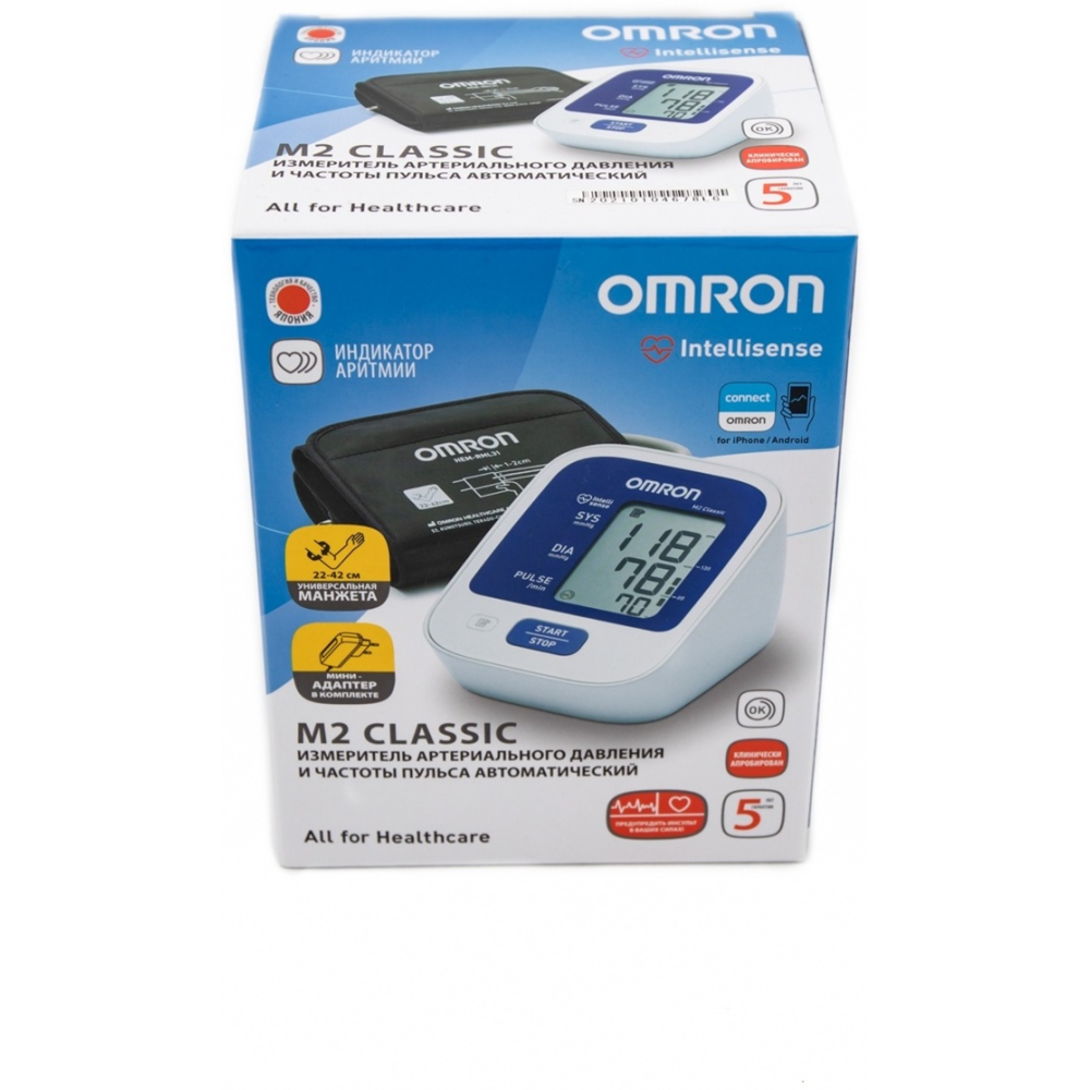 Omron M2 Classic (HEM-7122-ALRU) — это улучшенная версия базового автоматического тонометра на плечо, которая отличается расширенной памятью, наличием датчика аритмии и богатой комплектацией. Индекс «ALRU» означает, что в комплект уже включены сетевой адаптер и универсальная манжета.