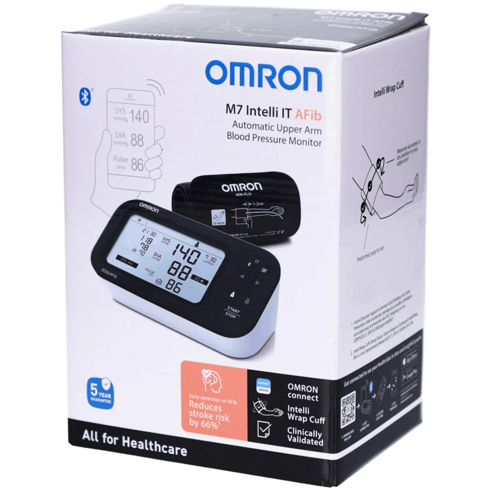 Omron M7 Intelli IT (HEM-7380T1-EBK) — это самая современная модификация флагманского тонометра Omron (обновленная версия модели 7361T). Это высокотехнологичный медицинский прибор «2 в 1», который объединяет профессиональную точность измерения давления со скринингом мерцательной аритмии (AFib) для предотвращения риска инсульта.