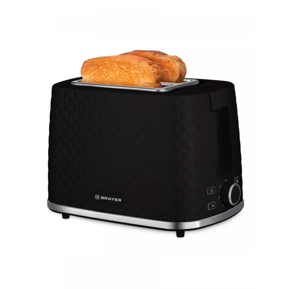 BRAYER 2101BR-BK — компактный тостер мощностью 930 Вт с 7 режимами обжаривания, функциями подогрева, разморозки и отмены. Оснащён автоматическим центрированием и выбросом тостов, съёмным поддоном для крошек и защитой от перегрева. Идеален для быстрого и удобного приготовления хрустящих тостов.
