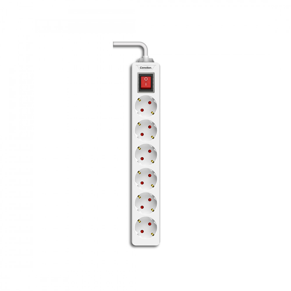Компактный сетевой удлинитель с тремя розетками переменного тока (AC) для дома и офиса. Подходит для различных типов вилок (EU, VDE и др.), имеет защитные шторки, кнопку питания и LED-индикатор
