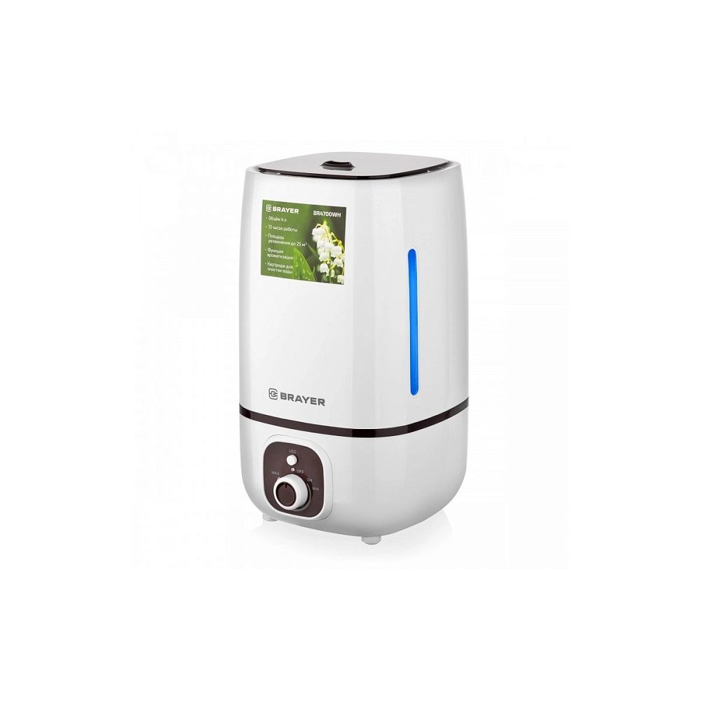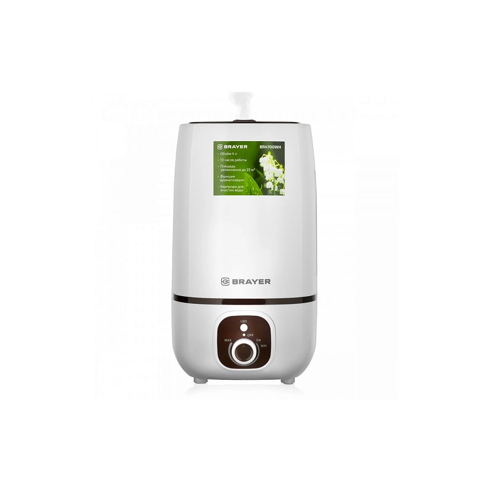 Увлажнитель воздуха Brayer 4700BR-WH с принципом ультразвуковых колебаний помогает поддерживать оптимальный уровень влажности в помещениях, площадь которых не превышает 25 м². Внутренний резервуар объемом 4 л позволяет выполнять увлажнение продолжительное время без необходимости добавления воды. В данной модели реализованы регулировка направления увлажнения и интенсивности испарения. Brayer 4700BR-WH выполнен в корпусе с устойчивыми ножками на основании и отличается низким потреблением энергии. Из других особенностей отмечаются функция ароматизации и автоматическое отключение при недостаточном количестве воды