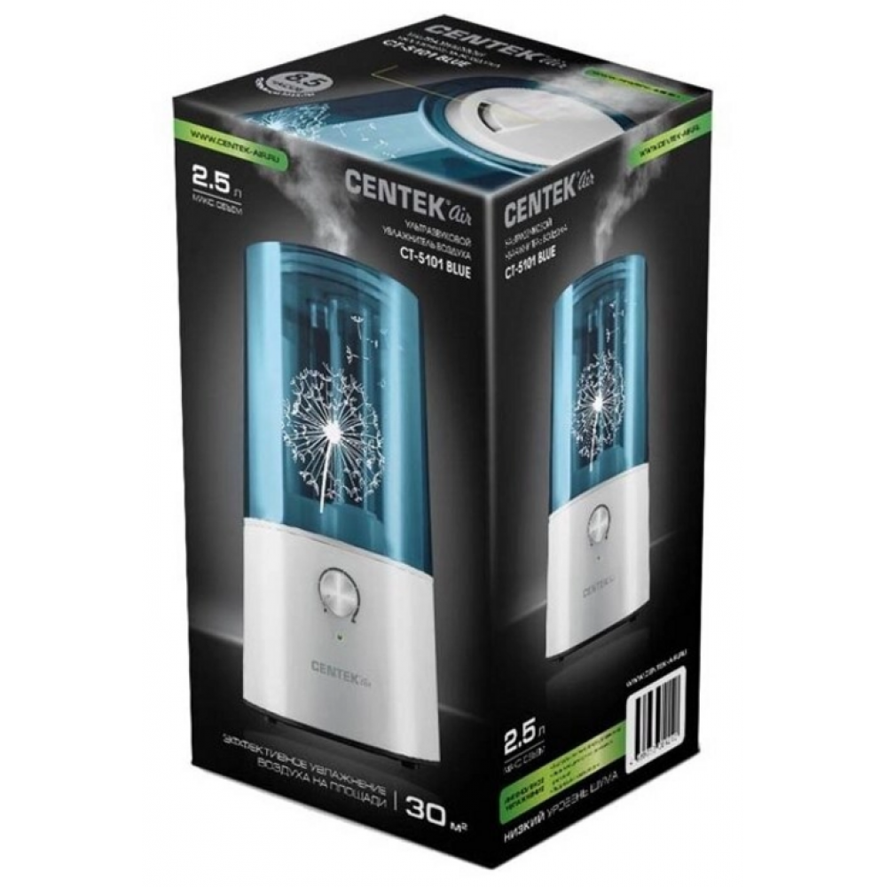 Ультразвуковой увлажнитель воздуха Centek CT- 5101B сделает комфортным климат в помещении. Особенно актуально его использование в отопительный сезон. Несмотря на компактный размер, прибор эффективно справится со своей задачей на площади до 30 м². Для начала работы нужно залить воду в специальный резервуар. Его объем равен 2.5 л, а расходуется до 300 мл в час, поэтому продолжительность рабочего цикла составит около 8 часов. Количество испаряемой влаги можно регулировать при помощи поворотного переключателя. Centek CT- 5101B потребляет совсем немного энергии – всего 25 Вт, а польза его несомненна: вода в воздухе способствует оседанию аллергенов, препятствует пересыханию кожи и благоприятно сказывается на состоянии комнатных растений