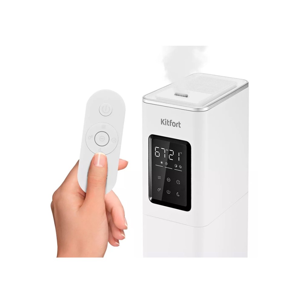 На цифровом дисплее Kitfort КТ-2880 показывает уровень влажности в комнате и предупреждает о пустеющей емкости. Вы можете управлять устройством с помощью пульта ДУ или сенсорных кнопок на корпусе. Модель поддерживает ручную настройку интенсивности испарения, использования эфирных масел для ароматизации. Устройство дополнено УФ-лампой и фильтр-картриджем для очистки/смягчения воды.