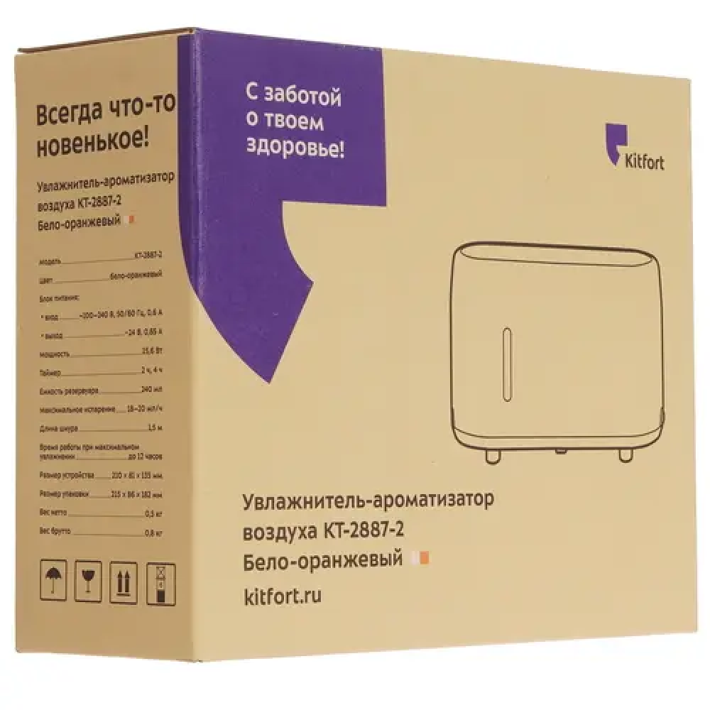 Увлажнитель воздуха Kitfort КТ-2887-2 с ультразвуковой мембраной превращает воду в мелкодисперсный холодный пар и подает его в помещение. Он имеет компактные размеры и резервуар объемом 0.24 л. Корпус выполнен из пластика в оранжевом цвете. Верхняя часть снимается для простой очистки. Удобное добавление воды в резервуар обеспечивается благодаря отверстию в верхней части и мерному стакану.