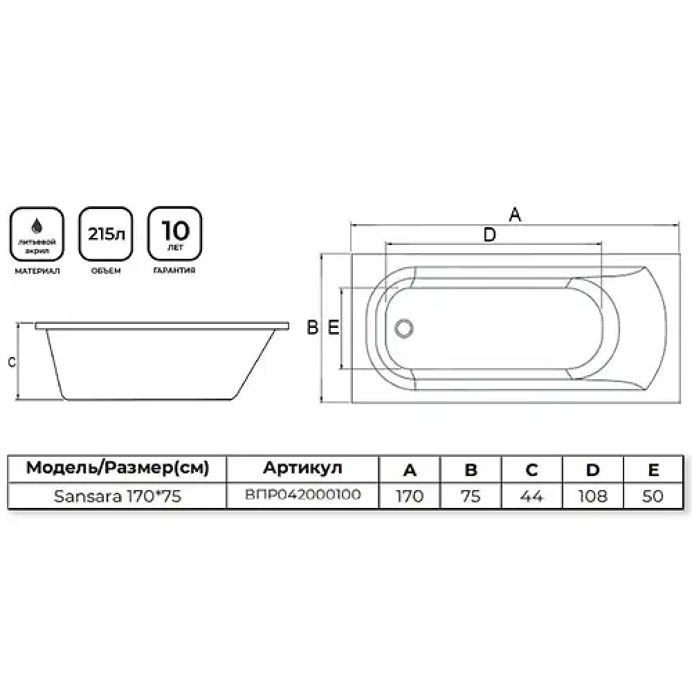 Акриловая ванна Alba Spa Sansara прямоугольная 170х75 имеет следующие характеристики: