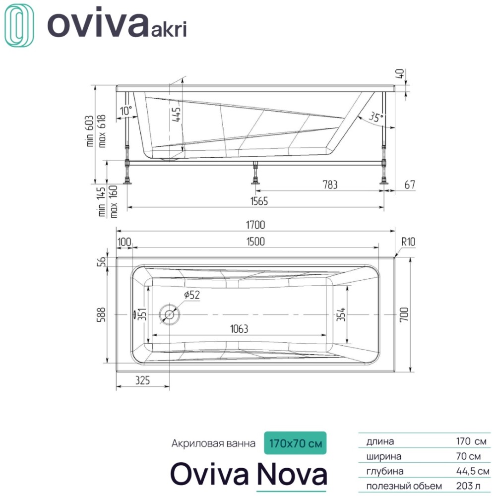Ванна OVIVA Nova 170х70 имеет объем 203 литра, что позволяет комфортно разместиться одному человеку.
