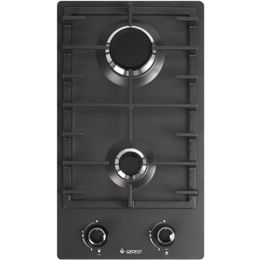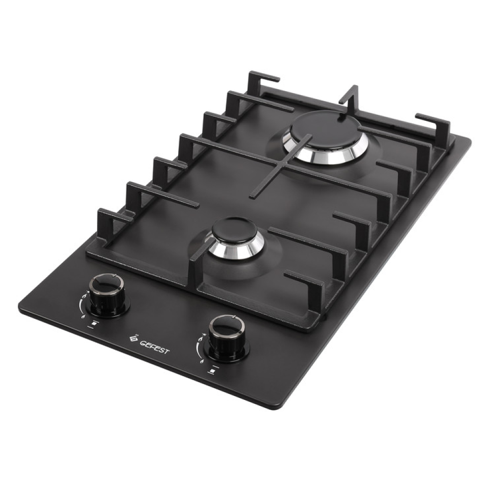 Черная газовая варочная панель, ширина 30 см, поверхность - эмалированная. Конфорки защищены массивной и устойчивой чугунной решеткой. Две газовые горелки различной мощности оснащены газ-контролем, электроподжиг - автоматический. Ручки регулировки мощности имеют фиксированное положение с минимально возможным пламенем, без затухания.