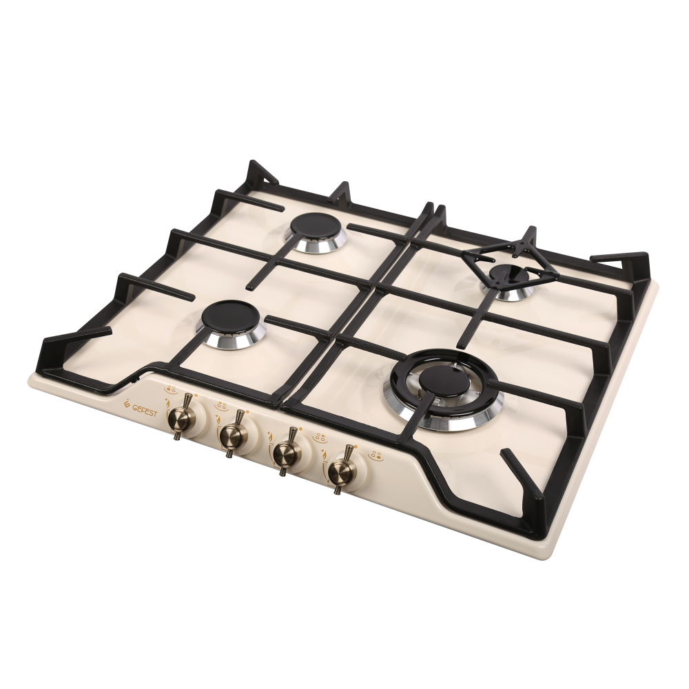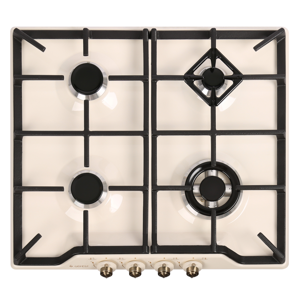 Газовая варочная панель Гефест с покрытой эмалью кремового цвета с рисунком "ретро" поверхностью, ширина 59 см. Несмотря на скромные размеры, варочная поверхность укомплектована системой газ-контроля, перекрывающего подачу газа при случайном угасании пламени. А чтобы не загасить газовую горелку, предусмотрено фиксированное положение переключателя для экономного горения. Электророзжиг встроен в поворотные ручки и включается автоматически. Две средние конфорки, малая и большого диаметра обеспечивают возможность использовать разную посуду для приготовления, а две составные чугунные решетки выдерживают тяжесть большой кастрюли без проблем. Эксплуатация не вызовет затруднений, управление - простое.