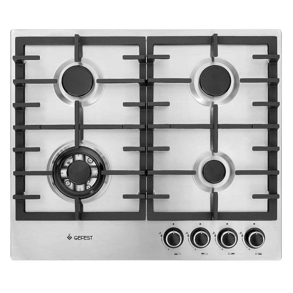 Варочная поверхность шириной 60 см, из нержавеющей стали. Тонкую металлическую пластину дополняют массивные составные чугунные решетки, им не страшна тяжесть толстостенной посуды или огромной кастрюли с водой. Надежность и долговечность чувствуется с первого взгляда, управление конфорками - интуитивно, вращением поворотного переключателя регулируется мощность горения, вплоть до фиксированного положения - минимально возможного, без риска погасить конфорку.