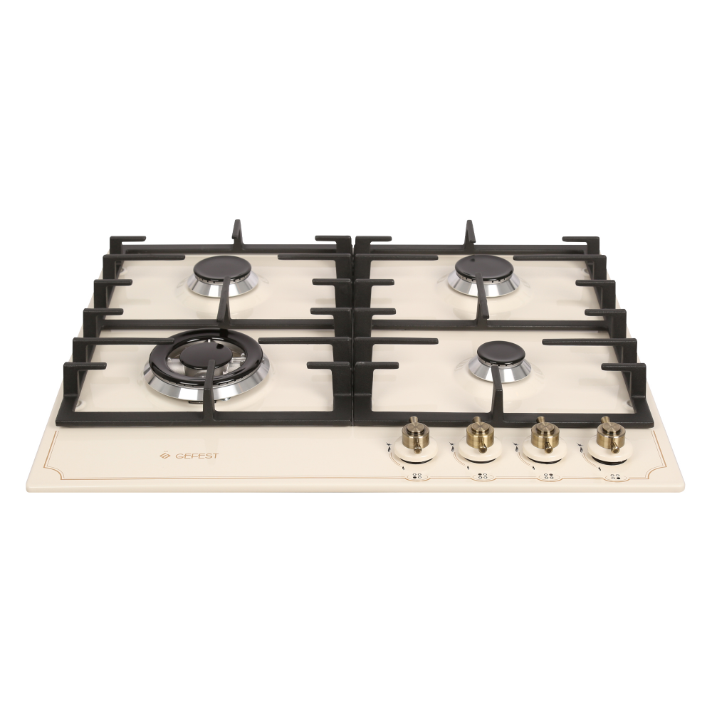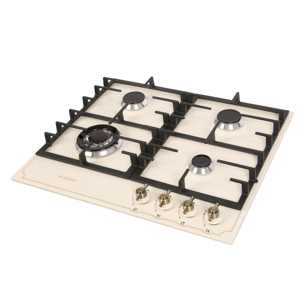Варочная панель шириной шестьдесят сантиметров, эмалированная поверхность - кремовая, декорирована рисунком в стиле "ретро" и дополнена составными чугунными решетками. На панели управления, расположенной в правой части, размещены поворотные переключатели с интегрированным электроподжигом и фиксированным положением "малое пламя", когда конфорка работает на минимально возможном уровне, без потухания. Все горелки оснащены газ-контролем, две стандартные дополнены малой, экономичной и двухзонной конфоркой, способной к быстрому нагреву и поддержанию необходимой температуры при обжарке.