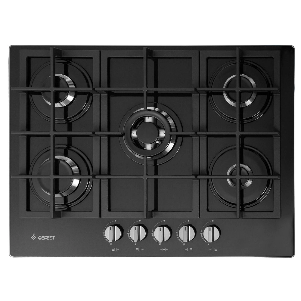Газовая варочная панель, черного цвета поверхность - стеклянная, с толщиной в 8 мм. Пять конфорок размещены на рабочем столе шириной 70 см, монтажный проем позволяет встраивание в мебельный корпус шириной 60 см. Газовые горелки расположены на широком защитном основании, сверху накрываются чугунными решетками (составные, 3 панели). Все конфорки - различного диаметра и мощности, оснащены газ-контролем (перекрывает подачу газа к горелке при угасании пламени). Электроподжиг встроен в поворотные ручки, мощность пламени регулируется поворотом переключателя, есть фиксированное положение "малое пламя" - минимально возможное горение. Для быстрой обжарки продуктов на тонкостенной посуде и нагрева большой кастрюли с водой - предусмотрена двухзонная конфорка, с двумя рядами пламени.