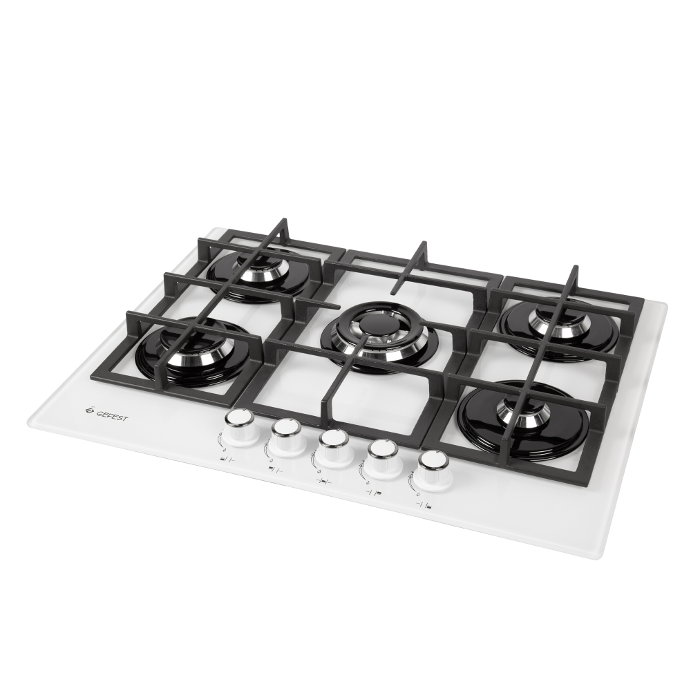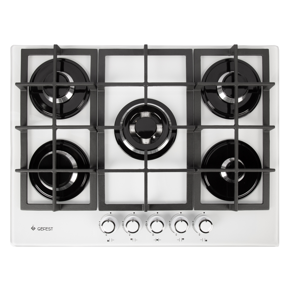 Газовая варочная панель, белого цвета поверхность - стеклянная, с толщиной в 8 мм. Пять конфорок размещены на рабочем столе шириной 70 см, монтажный проем позволяет встраивание в мебельный корпус шириной 60 см. Газовые горелки расположены на широком защитном основании, сверху накрываются чугунными решетками (составные, 3 панели). Все конфорки - различного диаметра и мощности, оснащены газ-контролем (перекрывает подачу газа к горелке при угасании пламени). Электроподжиг встроен в поворотные ручки, мощность пламени регулируется поворотом переключателя, есть фиксированное положение "малое пламя" - минимально возможное горение. Для быстрой обжарки продуктов на тонкостенной посуде и нагрева большой кастрюли с водой - предусмотрена двухзонная конфорка, с двумя рядами пламени.