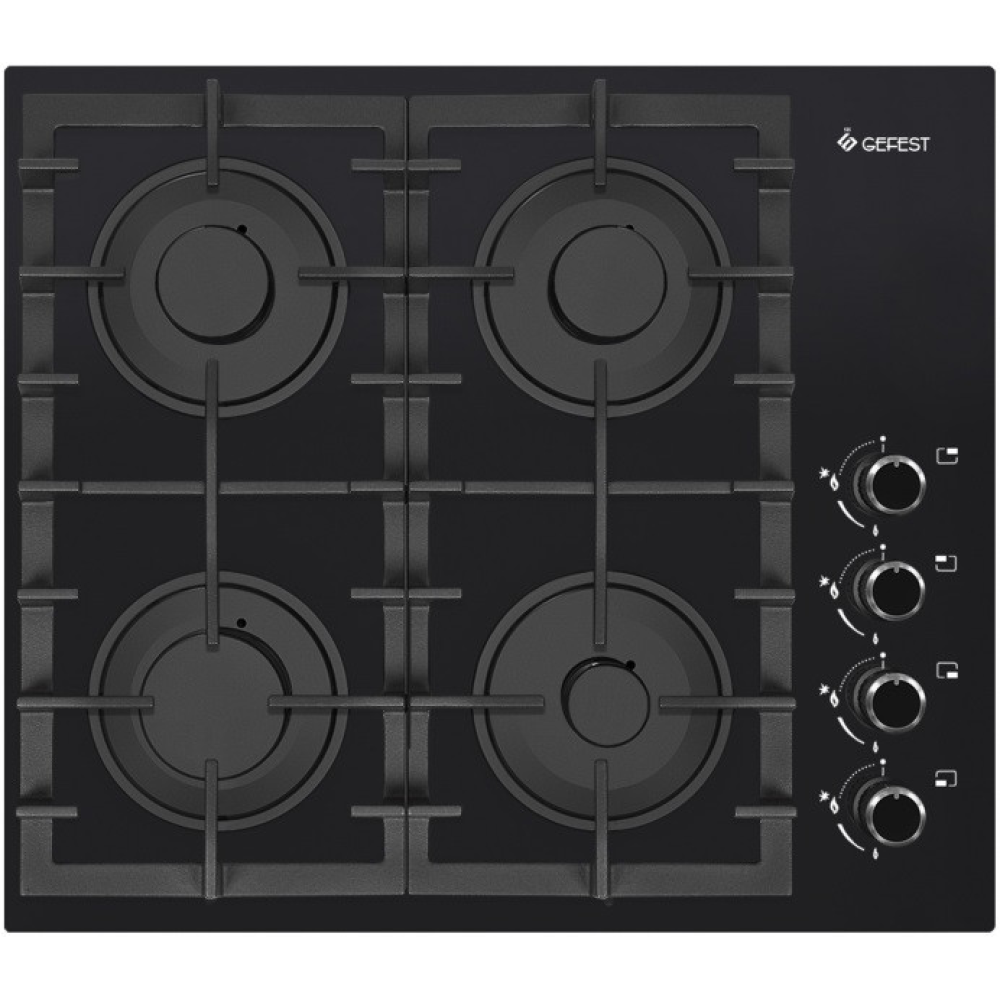 Черная варочная панель со стеклянной поверхностью, ширина 60 см. Поворотные ручки декорированы накладками, плавная регулировка мощности горения дополнена фиксированным положением (малое пламя). Сами горелки защищены составными фигурными решетками из чугуна, оснащены газ-контролем. Электроподжиг происходит автоматически, при повороте переключателя. Конфорки имеют различный размер и мощность, две средние дополнены большой и малой, экономичной.